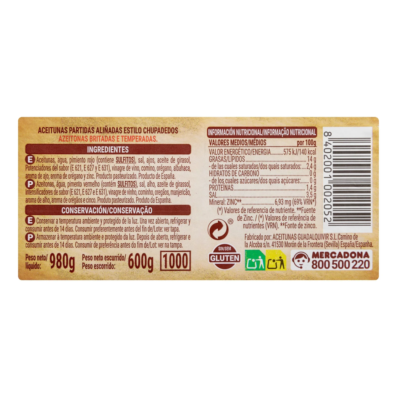 Aceitunas verdes Chupadedos Huerta de Barros partidas aliñadas, ideal para disfrutar a diario como aperitivo o acompañamiento. Un clásico del mercado español.
