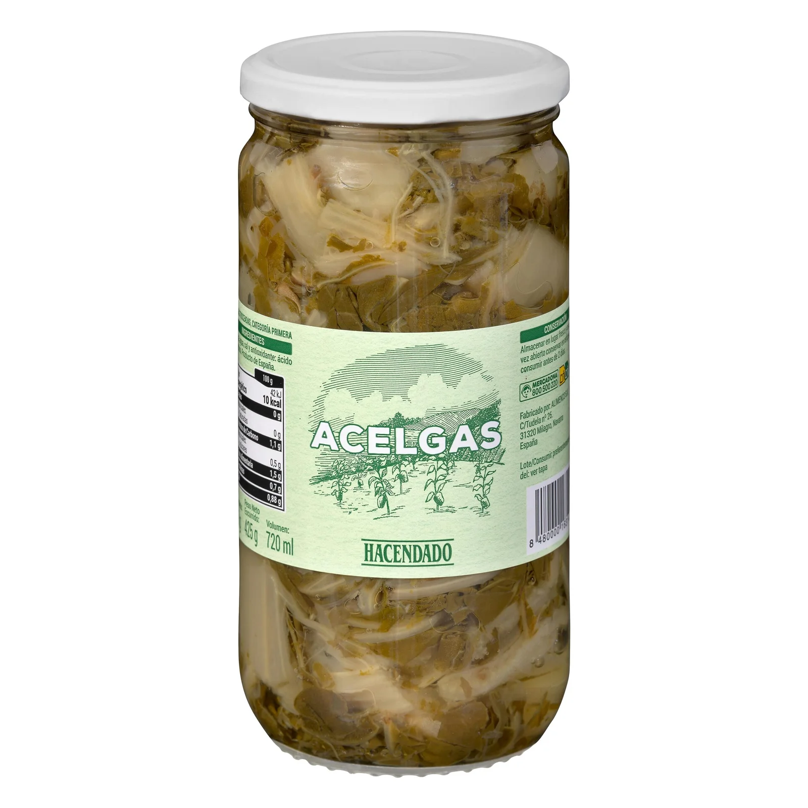 Acelgas troceadas Hacendado, un clásico del mercado español. Forma parte de la variedad de conservas verdura. Ideal para españoles fuera de Europa que buscan sabores de casa y para europeos que desean productos auténticos de España.