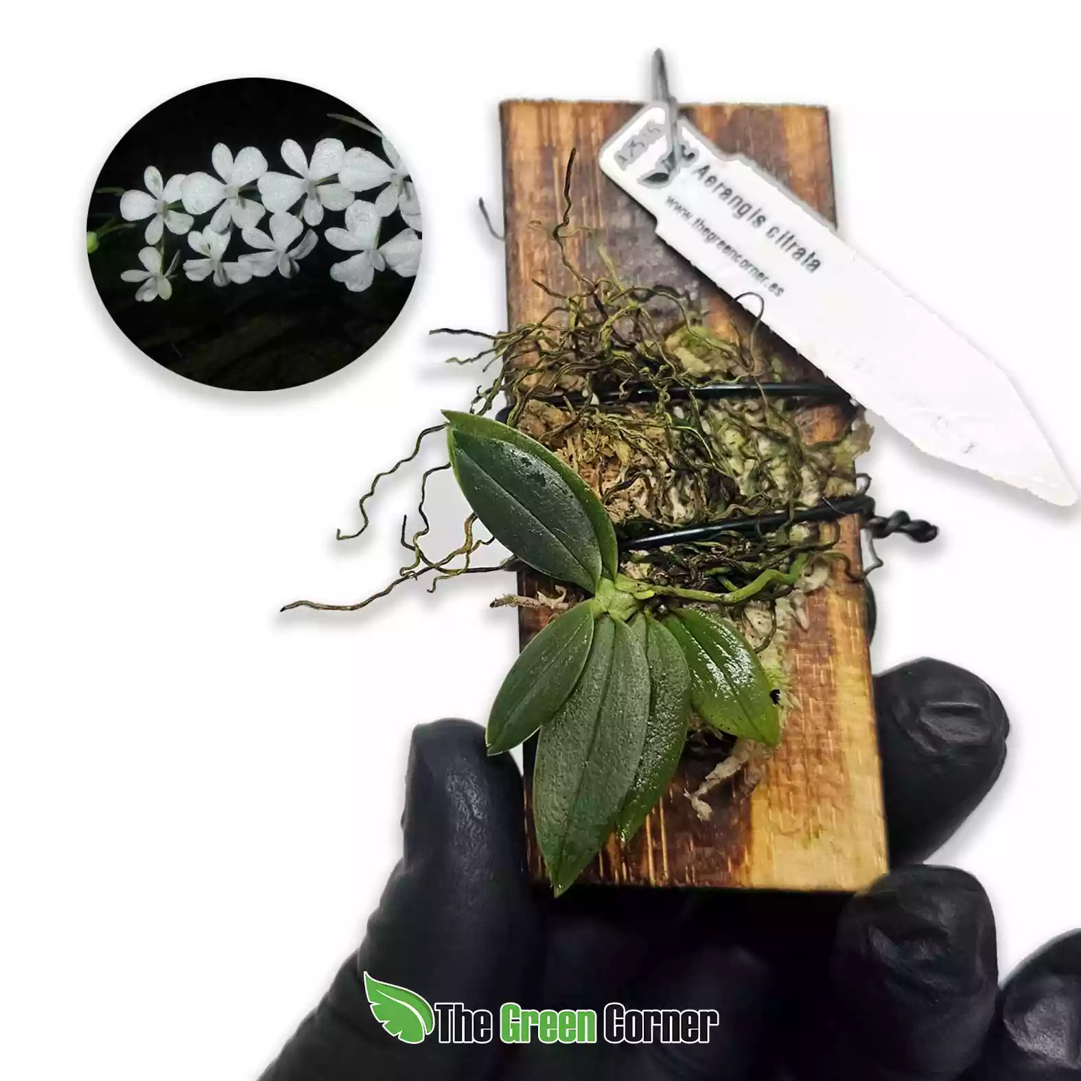 Orquídea epífita de Madagascar con flores blancas perfumadas y espolón largo. Aerangis citrata requiere luz suave, humedad alta y ventilación. Ideal para montajes o cultivo en interiores controlados, perfecta para coleccionistas de especies aromáticas y delicadas.