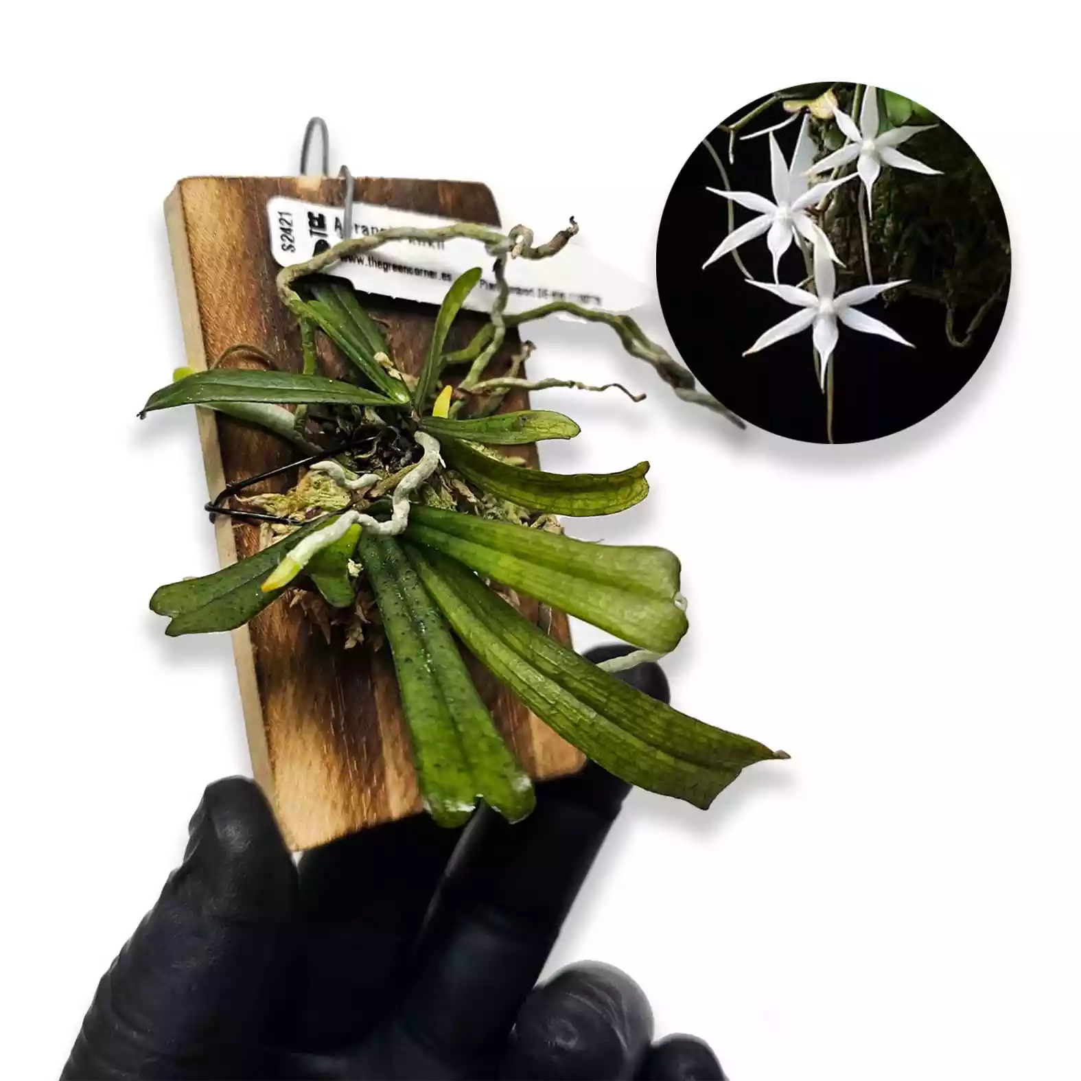 Aerangis kirkii es una orquídea epífita originaria del este de África y Madagascar, conocida por sus elegantes flores blancas con espolón largo y su dulce fragancia nocturna. Esta especie se adapta bien a condiciones de alta humedad y sombra parcial, lo que la hace ideal para cultivo en invernaderos o espacios controlados. Su floración es un verdadero espectáculo, con racimos colgantes de flores estrelladas que emanan un aroma suave y agradable, especialmente durante la noche para atraer a sus polinizadores naturales, las polillas esfíngidas. Prefiere montajes sobre troncos o placas con musgo sphagnum para mantener la humedad en las raíces, aunque también puede cultivarse en macetas con un sustrato aireado. Su cuidado incluye riegos frecuentes, buena circulación de aire y temperaturas moderadas. Como muchas Aerangis, esta orquídea requiere paciencia, pero recompensa con una floración espectacular.