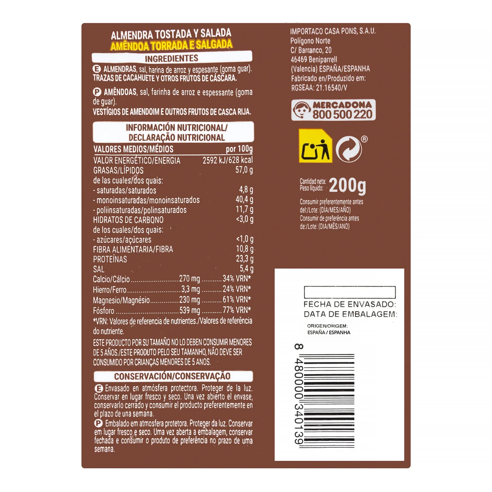 Almendra tostada y salada con piel, ideal para disfrutar a diario como aperitivo o acompañamiento. Un clásico del mercado español.