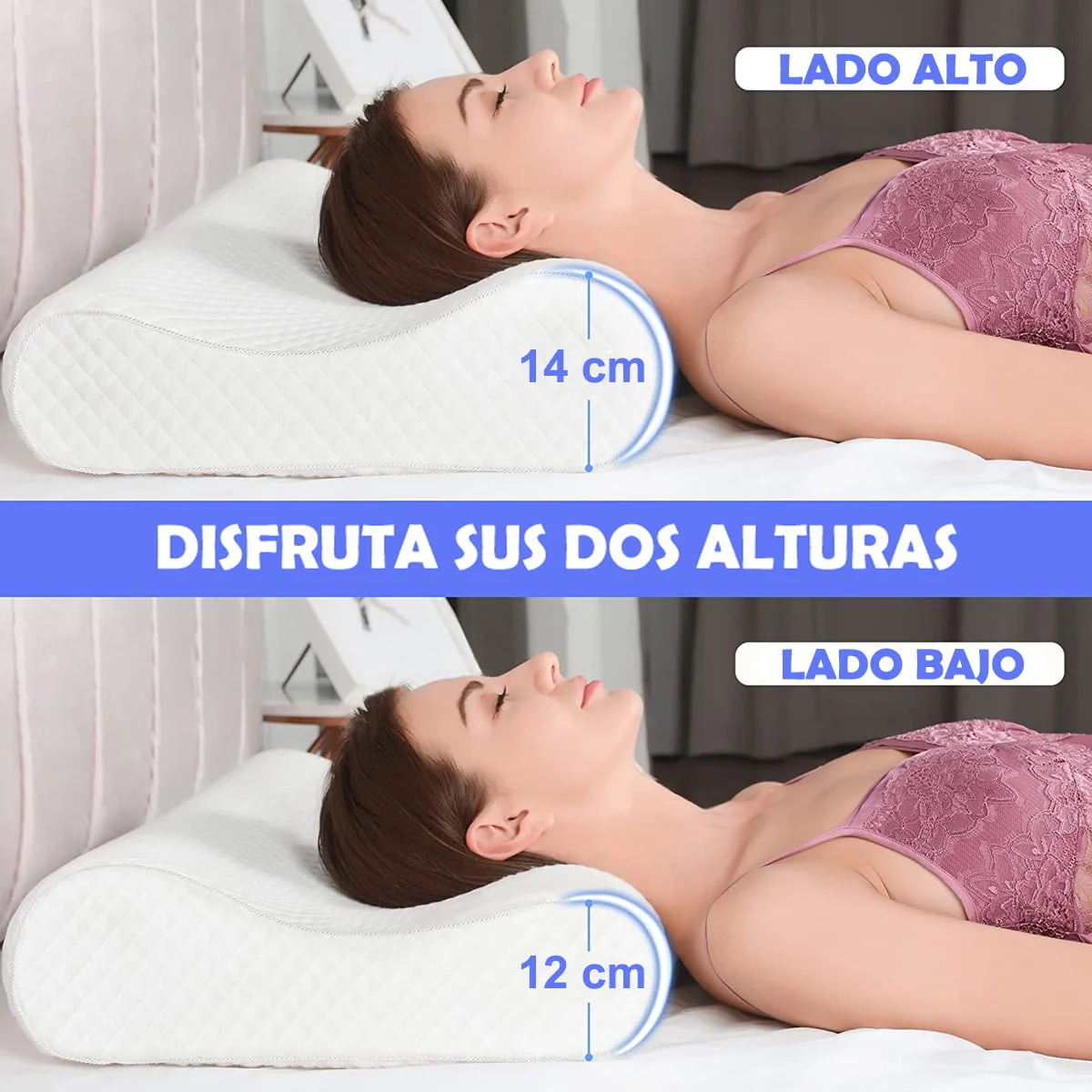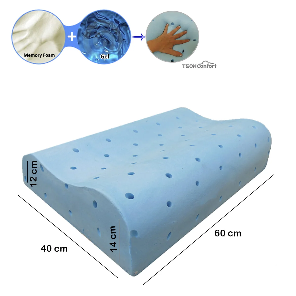 Disfruta la frescura y comodidad de la almohada con forma ergonómica cervical, fabricada en espuma memory foam con canales de aireación y con infusión de gel