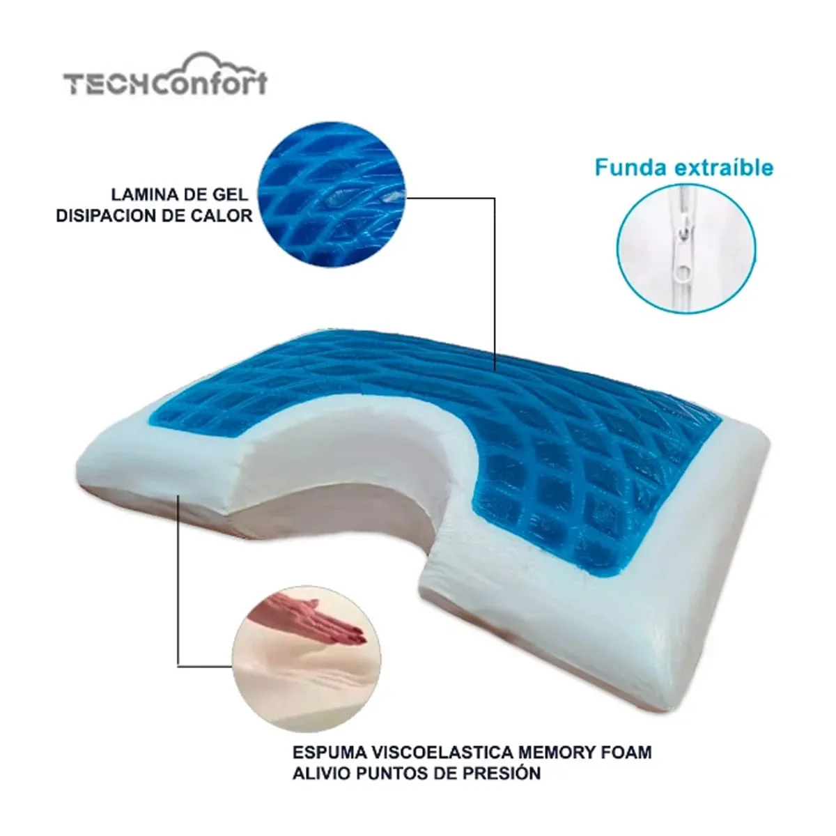 ACERCA DE ESTE PRODUCTO: Fabricada en espuma viscoelástica Memory Foam, con diseño para evitar molestias musculares al dormir de lado. Su forma y material de memory foam permite evitar presiones musculares e incomodidades al dormir permitiendo un descanso placentero. Su lámina de GEL ayuda a la disipación de calor para un descanso confortable. Se hunde suavemente para tomar la forma de su cabeza y cuello y aliviar puntos de presión. Su material es antimicrobiano, por lo tanto, es resistente a los alérgenos, el moho y los ácaros del polvo. Se adapta a la temperatura corporal logrando un descanso de alto confort.