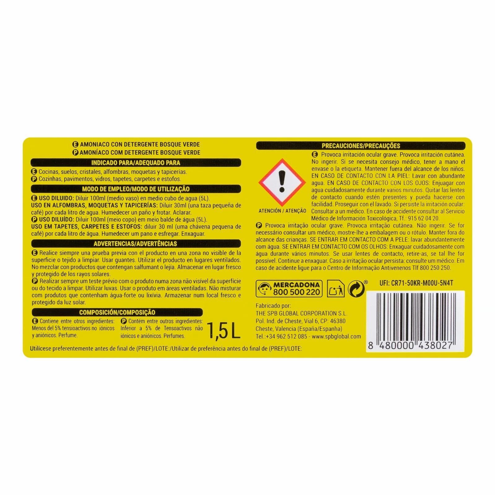 Amoníaco con detergente Bosque Verde es un producto de limpieza del hogar seleccionado dentro de la sección Lejía y líquidos fuertes de nuestro Mercado Español. Pensado para españoles que viven fuera y quieren seguir usando sus productos de siempre, y para clientes europeos que valoran la calidad y eficacia de la limpieza ‘a la española’.