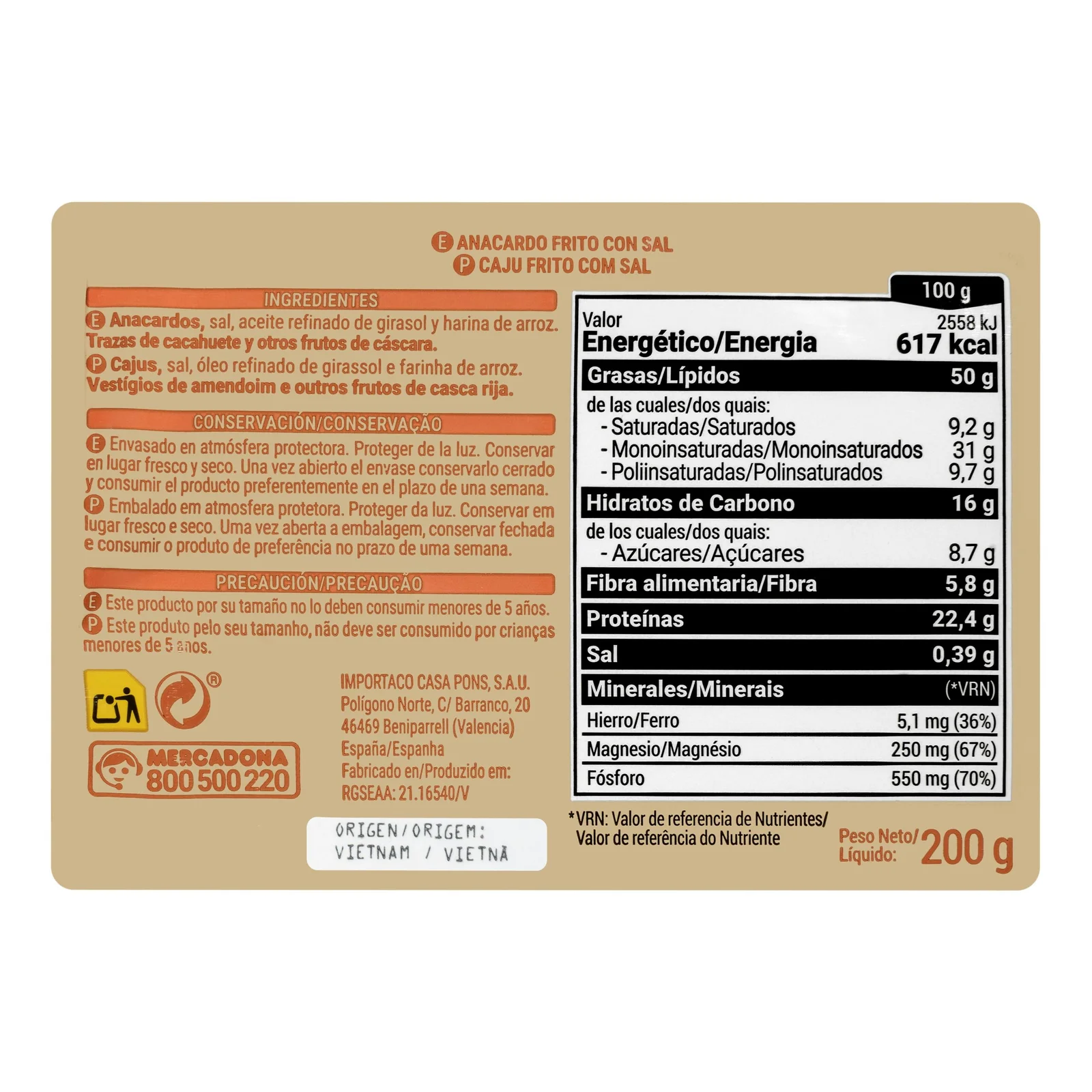 Anacardo frito salado, ideal para disfrutar a diario como aperitivo o acompañamiento. Un clásico del mercado español.