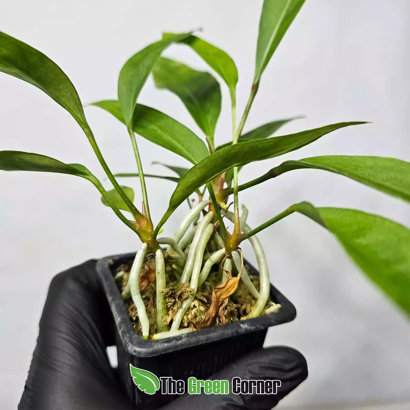 Anthurium gracile es una especie tropical epífita muy apreciada por su elegancia y facilidad de cultivo. Originaria de América Central y del Sur, destaca por sus hojas alargadas y brillantes de color verde intenso y por sus inflorescencias delgadas con espatas discretas de tono rojizo o rosado. Es ideal para interiores luminosos, invernaderos tropicales o colecciones de aroides. Se desarrolla mejor en ambientes con buena humedad ambiental, luz filtrada y temperaturas estables entre 18 °C y 28 °C. Puede cultivarse montado sobre troncos, en macetas con mezcla de corteza, musgo sphagnum y perlita, o en sustratos aireados para epífitas. Su mantenimiento es sencillo: riegos regulares sin encharcar, pulverizaciones ocasionales y fertilización ligera durante la temporada de crecimiento. Anthurium gracile aporta un toque natural y sofisticado a cualquier espacio, combinando resistencia, belleza y adaptabilidad. En The Green Corner la ofrecemos en ejemplares seleccionados y cultivados en condiciones controladas, listas para prosperar en interior luminoso o en ambientes tropicales protegidos.