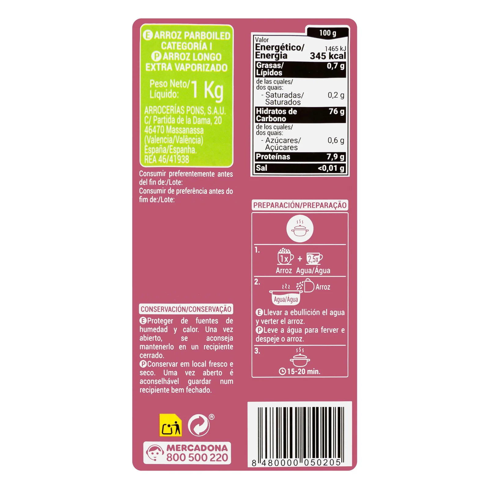 Arroz vaporizado Hacendado típico del mercado español.