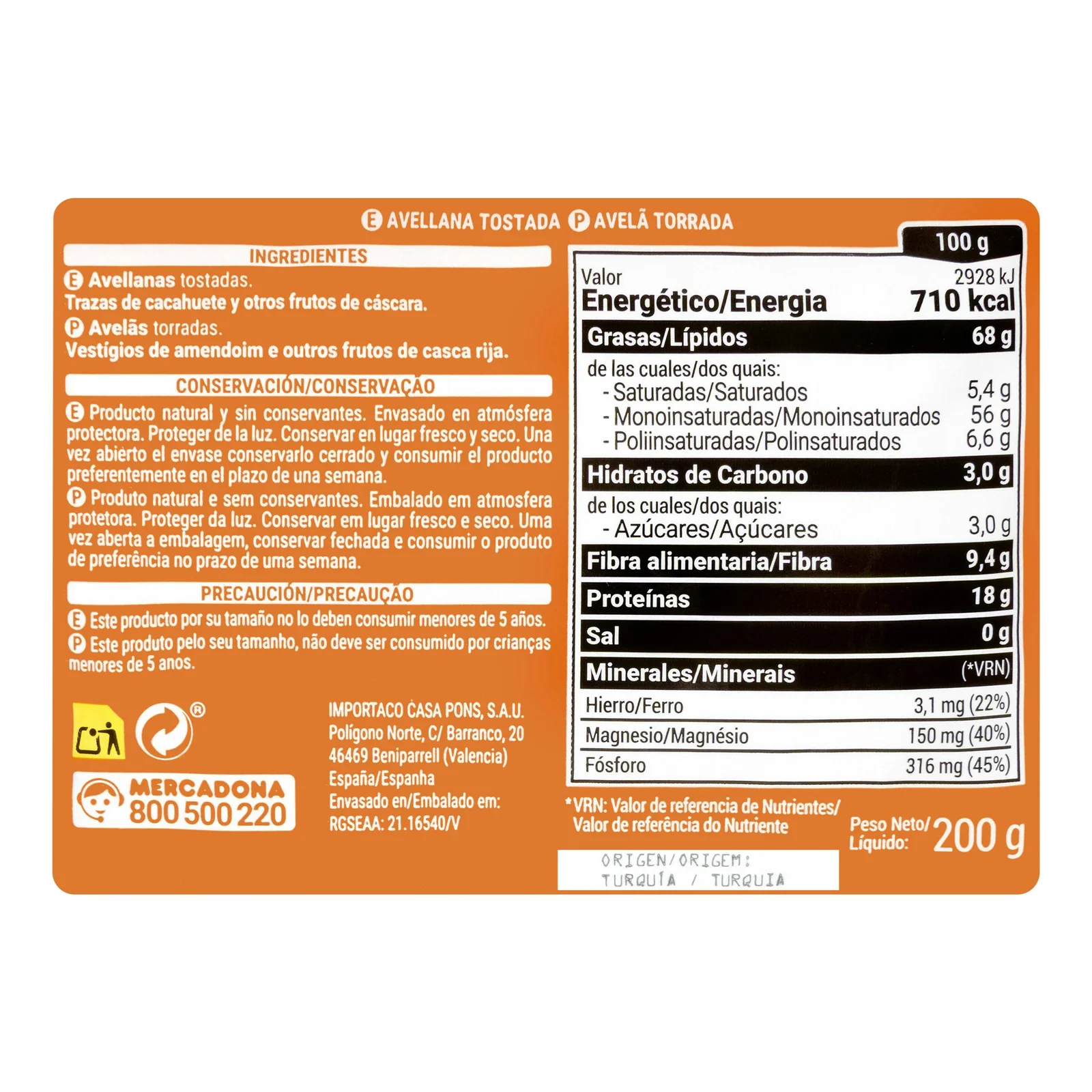 Avellana tostada 0% sal añadida, ideal para disfrutar a diario como aperitivo o acompañamiento. Un clásico del mercado español.