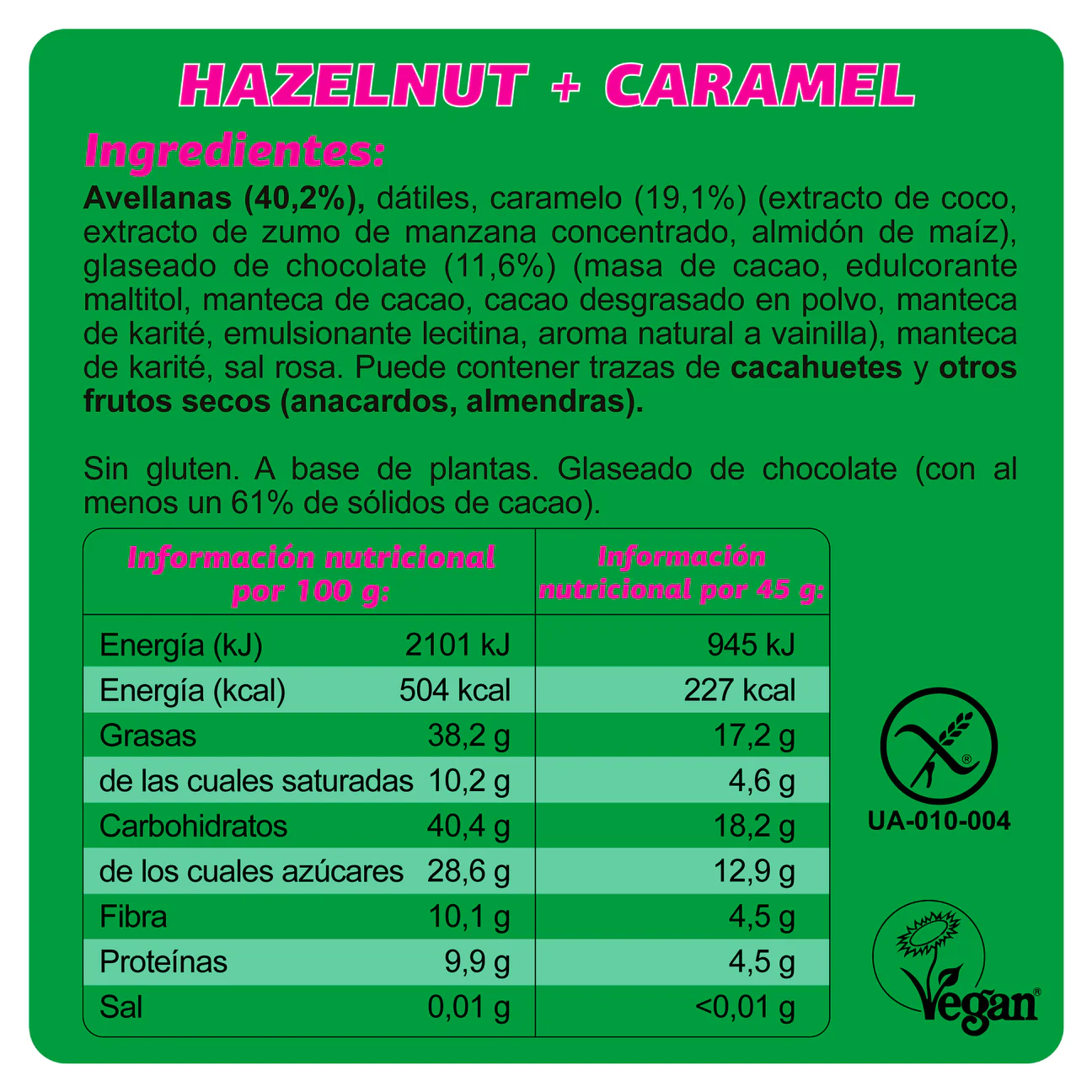 Barrita de proteínas para cualquier momento del día, una perfecta combinación de caramelo y avellana. Sin azúcar añadido, sin lactosa, sin gluten.