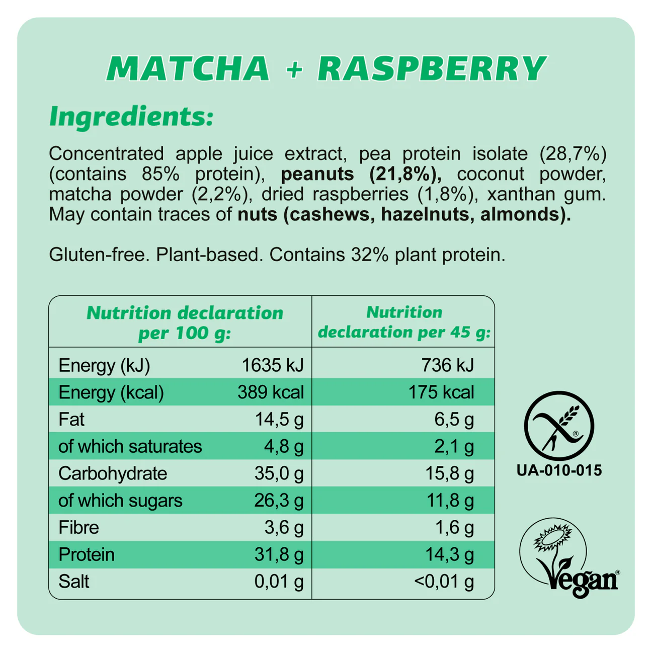 Barrita de proteínas para cualquier momento del día, cada barrita contiene 13 g de proteínas, matcha y un toque de frambuesa. Sin añadir azúcar blanco, lactosa ni gluten.