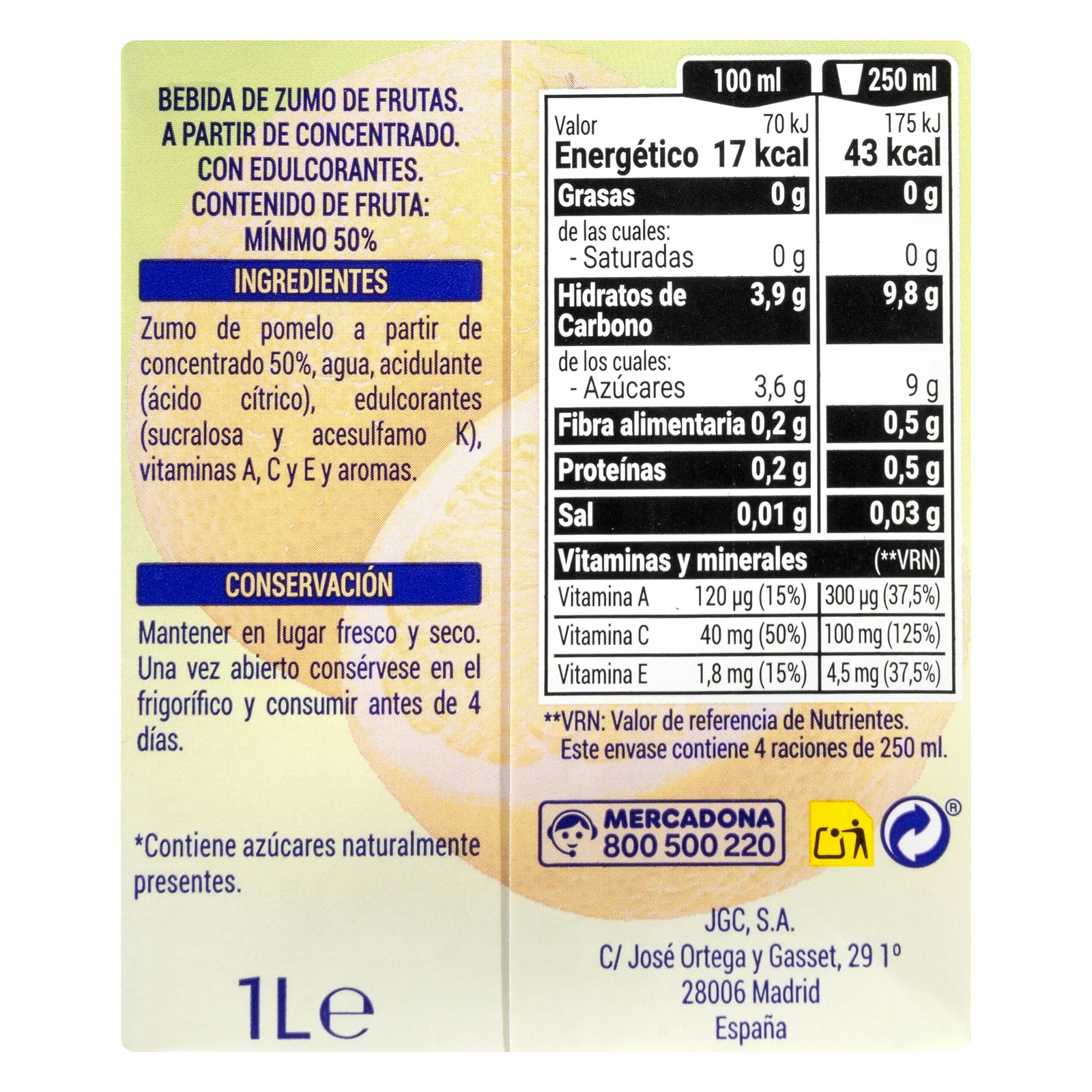 Bebida de pomelo Hacendado sin azúcares añadidos