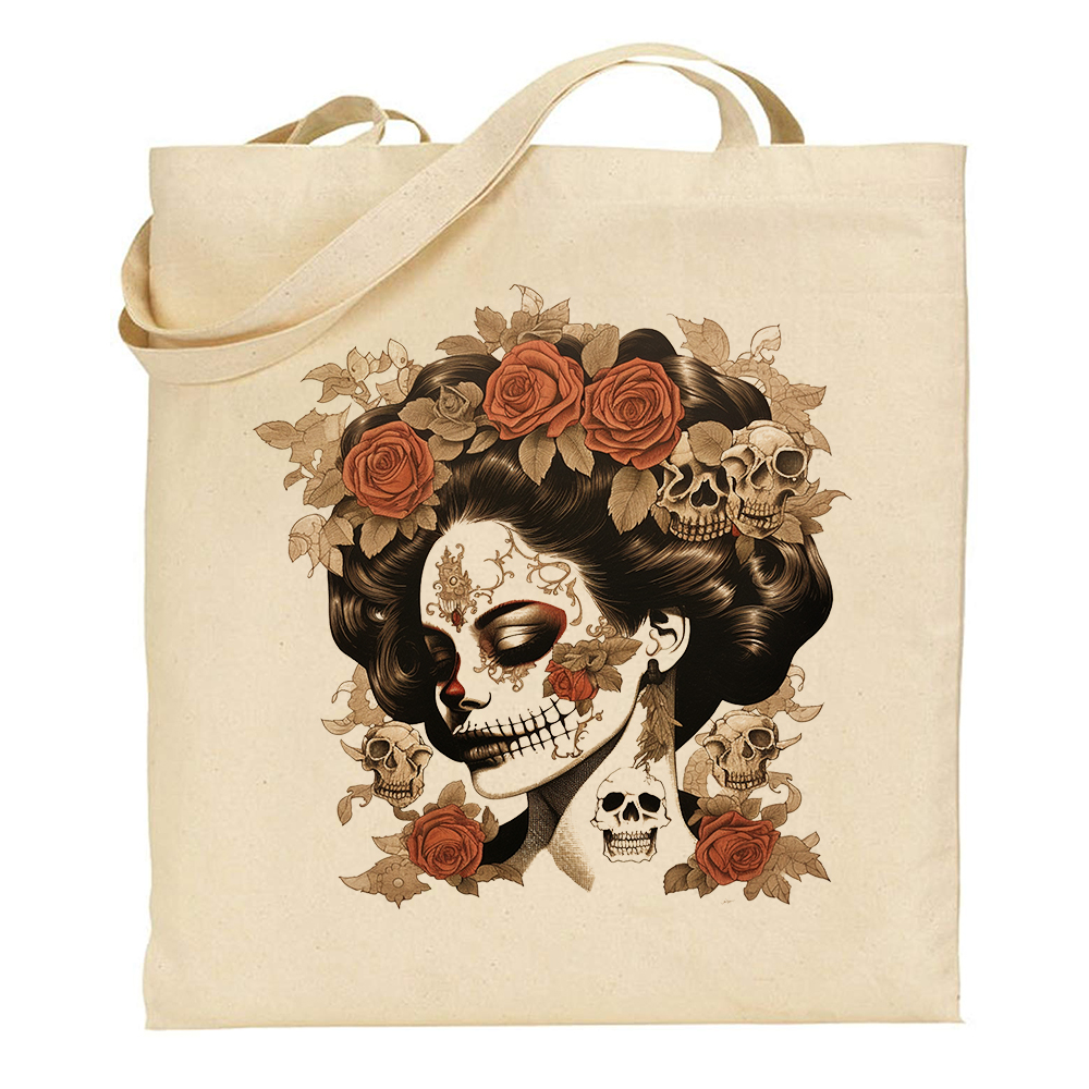 Bolsa de tela con dibujo de una calavera catrina con rosas en la cabeza, inspirado en la tradición de las calaveras mexicanas.