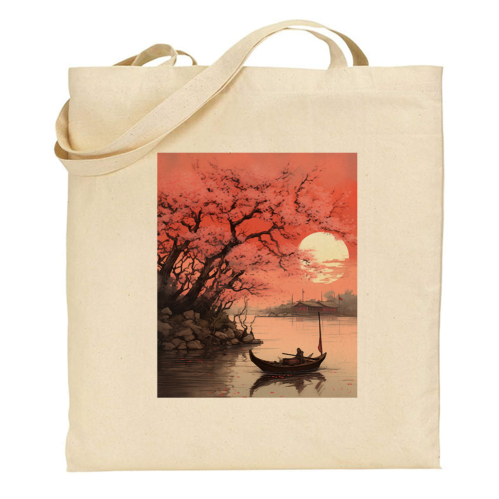 Si buscas una bolsa que combine practicidad y estilo, la has encontrado. Con un diseño inspirado en la técnica Sumi-E, esta pieza captura la esencia de un atardecer sereno: un lago tranquilo, un árbol en flor y una embarcación que parece flotar en un suspiro. Es ligera, funcional y tan bonita que no querrás dejarla en casa.