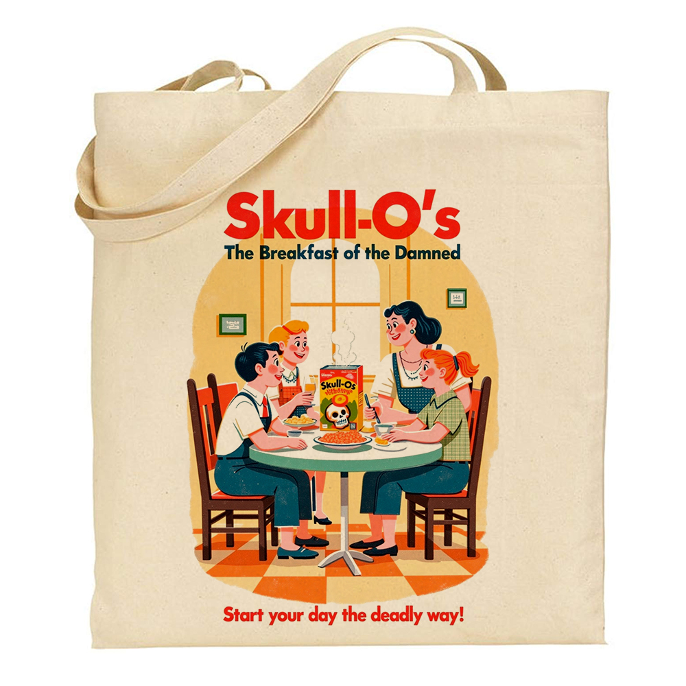¿Llevar cereales normales? Por favor. Esta bolsa es para quienes prefieren el desayuno con un toque de muerte súbita. “Skull-O’s” es lo que pasa cuando mezclas una escena típica de familia feliz con una caja de cereales maldita… y la conviertes en un accesorio que nadie podrá ignorar.