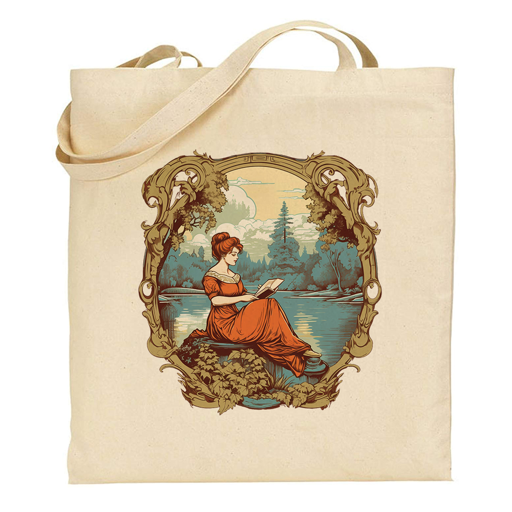 Esta tote bag Victorian Girl – Lake Reading combina elegancia y practicidad. Su diseño muestra a una dama victoriana en una escena de lectura junto a un lago, ideal para llevar libros, accesorios y todo lo necesario para el día a día.