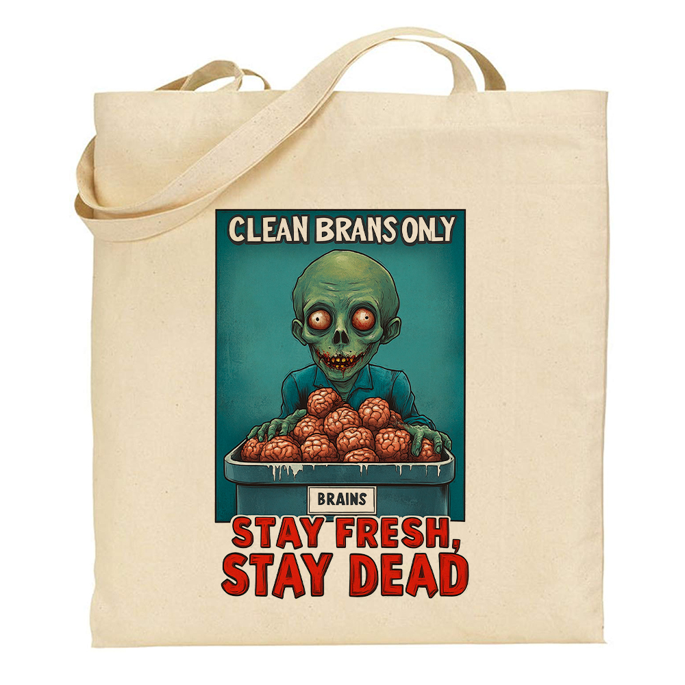 Una tote bag con valores claros: solo acepta lo bueno, lo crudo, lo brillante… aunque venga servido en bandeja de carnicero. “Stay Fresh, Stay Dead” es más que un lema, es una filosofía zombie para vivir la vida con descaro y una pizca de mal olor.