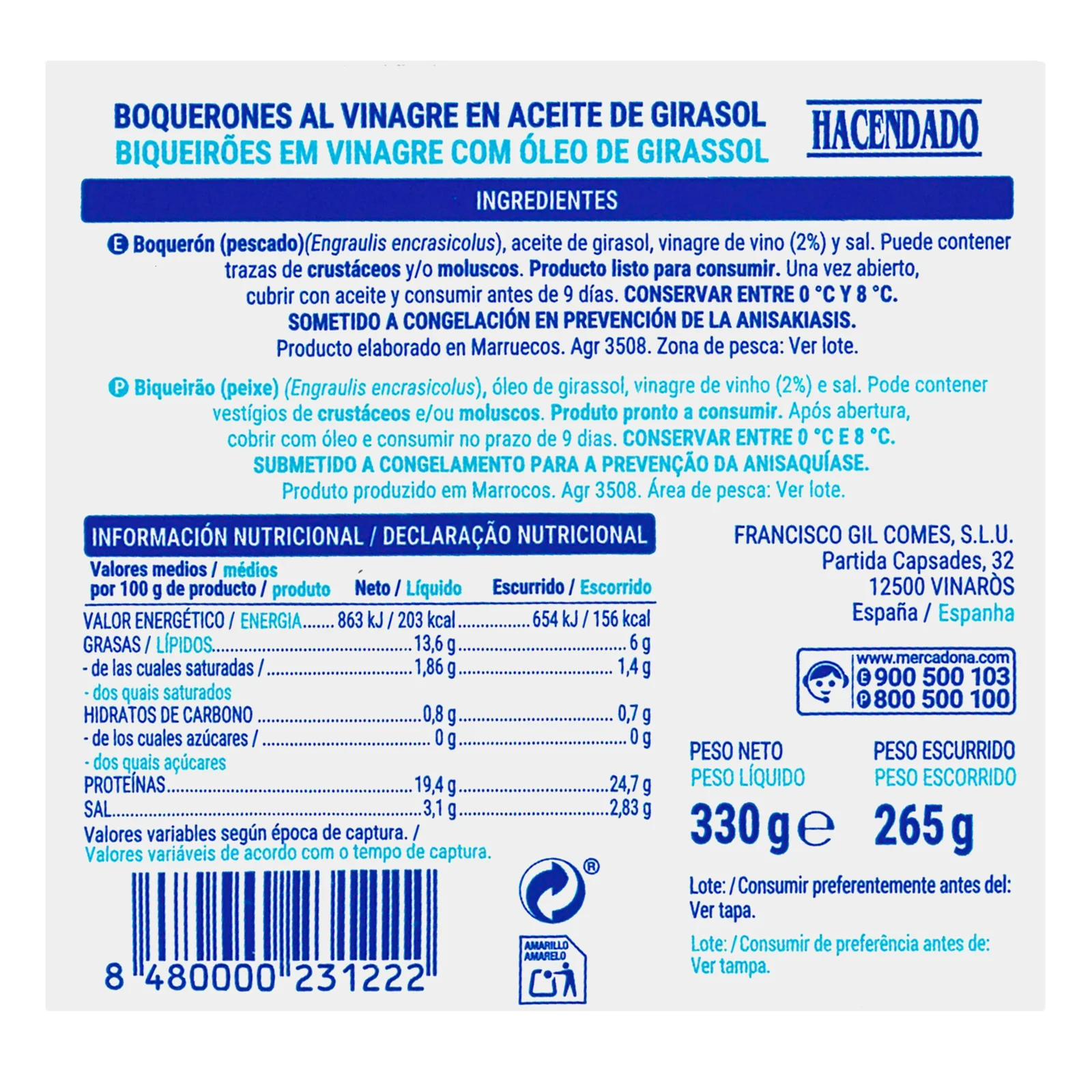 Boquerones al vinagre Hacendado en aceite de girasol