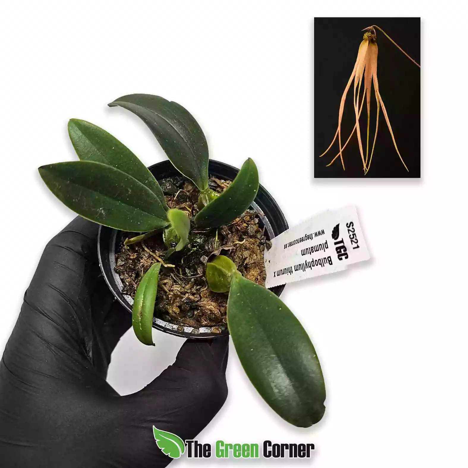 Bulbophyllum thiurum × plumatum es un híbrido dentro del género Bulbophyllum que combina características de dos especies originarias de bosques húmedos del Sudeste Asiático y Papúa Nueva Guinea. Este cruce destaca por su crecimiento compacto, su porte rastrero y sus inflorescencias ligeras y extremadamente ornamentales, herencia directa de Bulbophyllum plumatum, así como por la estructura floral más definida y firme procedente de Bulbophyllum thiurum. El resultado es una planta adaptable, vigorosa y especialmente atractiva para coleccionistas que buscan híbridos con estética exótica y un mantenimiento relativamente sencillo. Requiere luz filtrada, humedad alta y ventilación constante, condiciones clave para mantener el rizoma sano y promover floraciones regulares. Su cultivo funciona bien tanto en macetas muy aireadas como montado en corcho, donde puede mostrar mejor su crecimiento natural. Gracias a la hibridación, presenta mayor tolerancia a pequeñas variaciones de riego y temperatura en comparación con las especies puras, manteniendo aún la apariencia etérea característica del subgrupo. Bulbophyllum thiurum × plumatum es ideal para terrarios, invernaderos cálidos e instalaciones húmedas controladas, donde puede ofrecer floraciones vistosas y frecuentes si recibe un manejo adecuado.