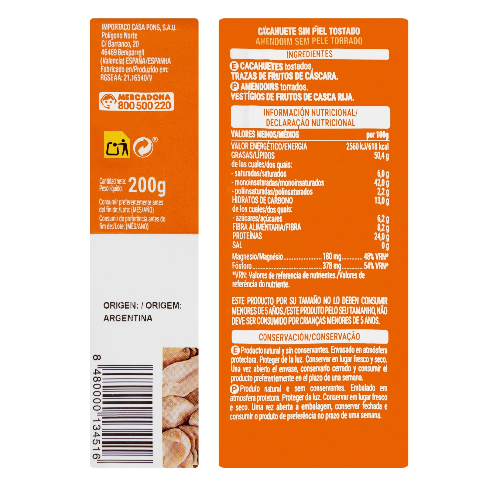 Cacahuete tostado pelado 0% sal añadida, ideal para disfrutar a diario como aperitivo o acompañamiento. Un clásico del mercado español.
