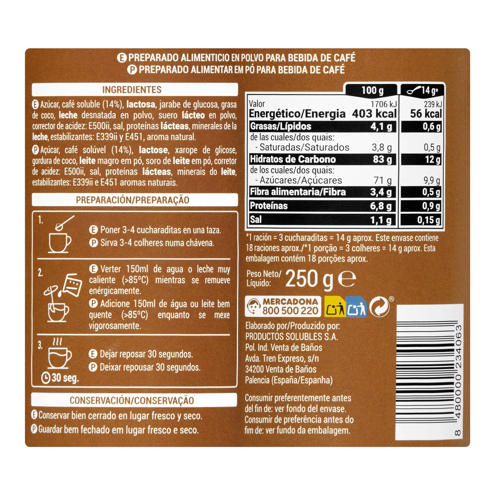 Café soluble cappuccino Hacendado con auténtico sabor de España.