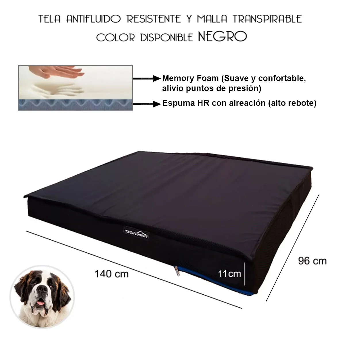 ¡Dale a tu mejor amigo el descanso que se merece! Presentamos la Cama Colchón para Mascotas Techconfort, diseñada para que tu peludo disfrute de un sueño reparador. ESPECIAL PARA RAZAS EXTRAGRANDES Y GIGANTES. Fabricada en espuma viscoelástica Memory Foam, esta cama se adapta a la perfección al cuerpo de tu mascota, brindándole una comodidad excepcional. ¡Es como si estuviera durmiendo en una nube!