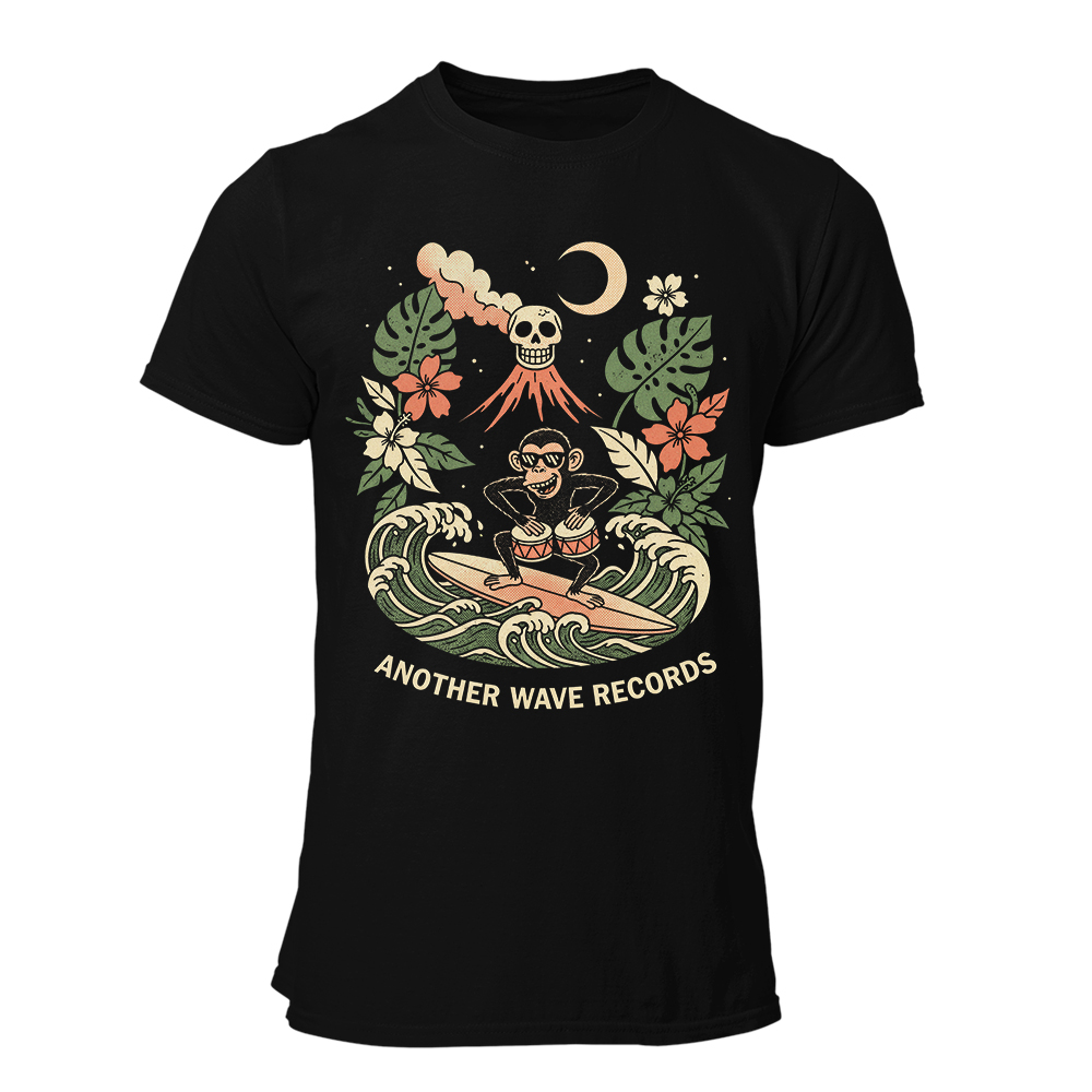 Another Wave Records, Monkey Bongo, surf rock, exotica, tiki culture, garage rock, camiseta negra, algodón premium, diseño vintage, rock instrumental, cultura surf, Friki Factoría, ilustración retro, tropical vibes, reverb, cultura 60s, handmade print, old school, surf scene, analog vibes, tiki party, skull volcano, camiseta hombre, indie label, beach vibes, retro tee, rock attitude, surf music, limited edition, old school design, tropical surf art.