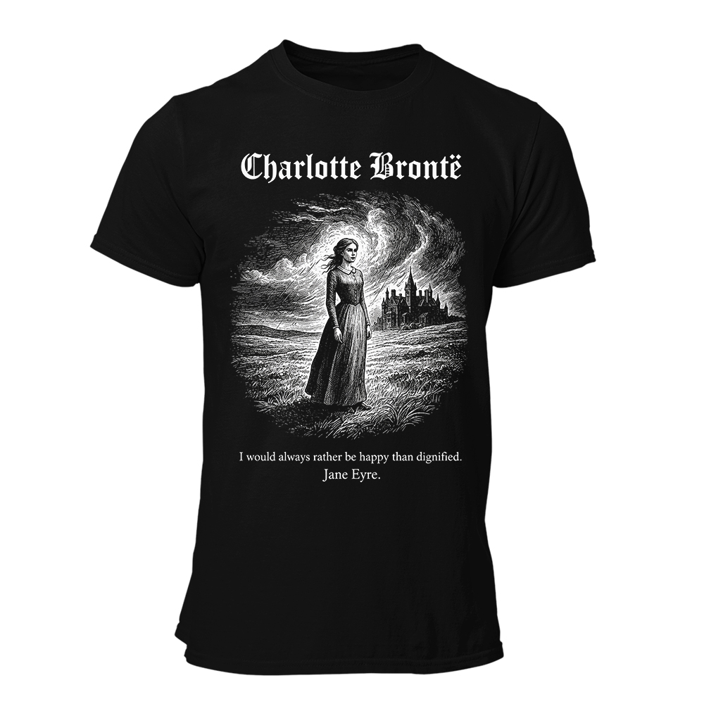 Si existiera una camiseta capaz de poner patas arriba la solemnidad victoriana y mezclarla con actitud moderna, sería exactamente esta. Aquí tienes una prenda que lleva a Charlotte Brontë estampada en blanco sobre negro como si fuera la portada de un disco de rock literario. La frase “I would always rather be happy than dignified.” no es solo un pensamiento bonito: es un zasca de 1847 que sigue de rabiosa actualidad. ¿Gente viviendo para aparentar? ¿Buscar dignidad vacía? Charlotte ya lo había mandado al carajo antes de que existiera Instagram.