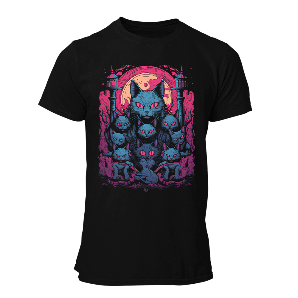 ¿Crees que los gatos son solo adorables? Esta camiseta está aquí para demostrarte que también pueden ser imponentes. Con una jauría (o mejor dicho, felinada) de gatos de mirada penetrante, un fondo que grita misterio y una luna rosa que añade un toque de magia oscura, esta prenda es para quienes no se conforman con lo típico.