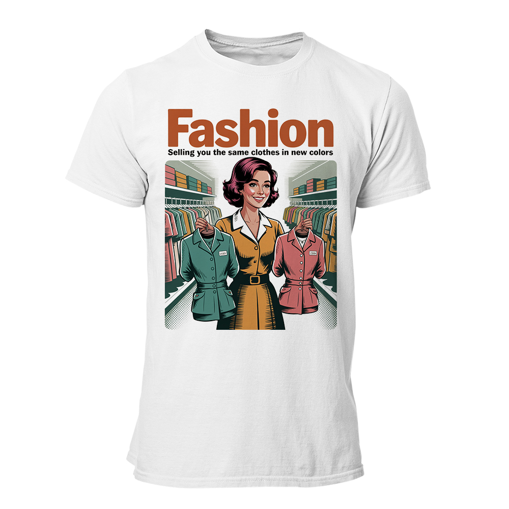 La camiseta que desmonta la mayor estrategia del mundo de la moda: venderte lo mismo… pero en otro color. Con un diseño retro y un mensaje que es puro humor ácido, es perfecta para quienes saben que las tendencias son circulares y que el “nuevo lanzamiento” probablemente ya estaba en tu armario en 2009.