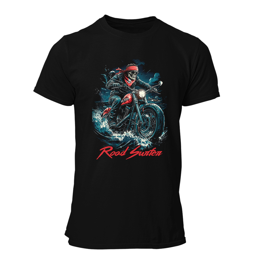 Si la carretera es tu ola y la moto tu tabla, entonces esta camiseta está hecha para ti. «Road Surfer» es para los que no conocen límites, para los que atraviesan cualquier terreno sin mirar atrás, para los que saben que la mejor manera de vivir es con el viento en la cara y el motor rugiendo.