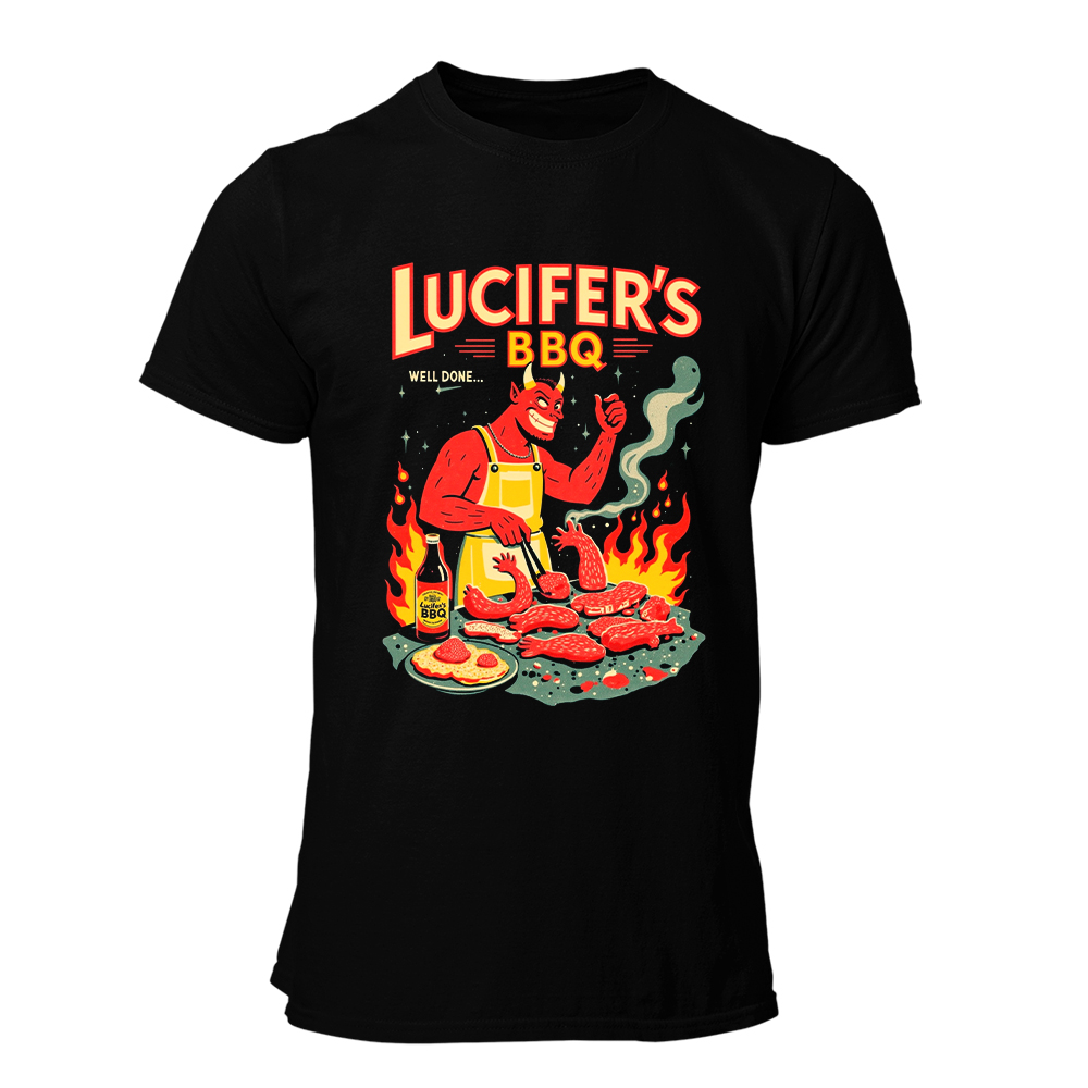 ¿Te gusta la carne al punto? A Lucifer no. Él la quiere bien hecha… y condenada. Esta camiseta es una delicia visual donde el mismísimo Diablo se convierte en el rey de la barbacoa, rodeado de fuego, brasas y cortes de carne que harían llorar de emoción a cualquier carnívoro con alma oscura.
