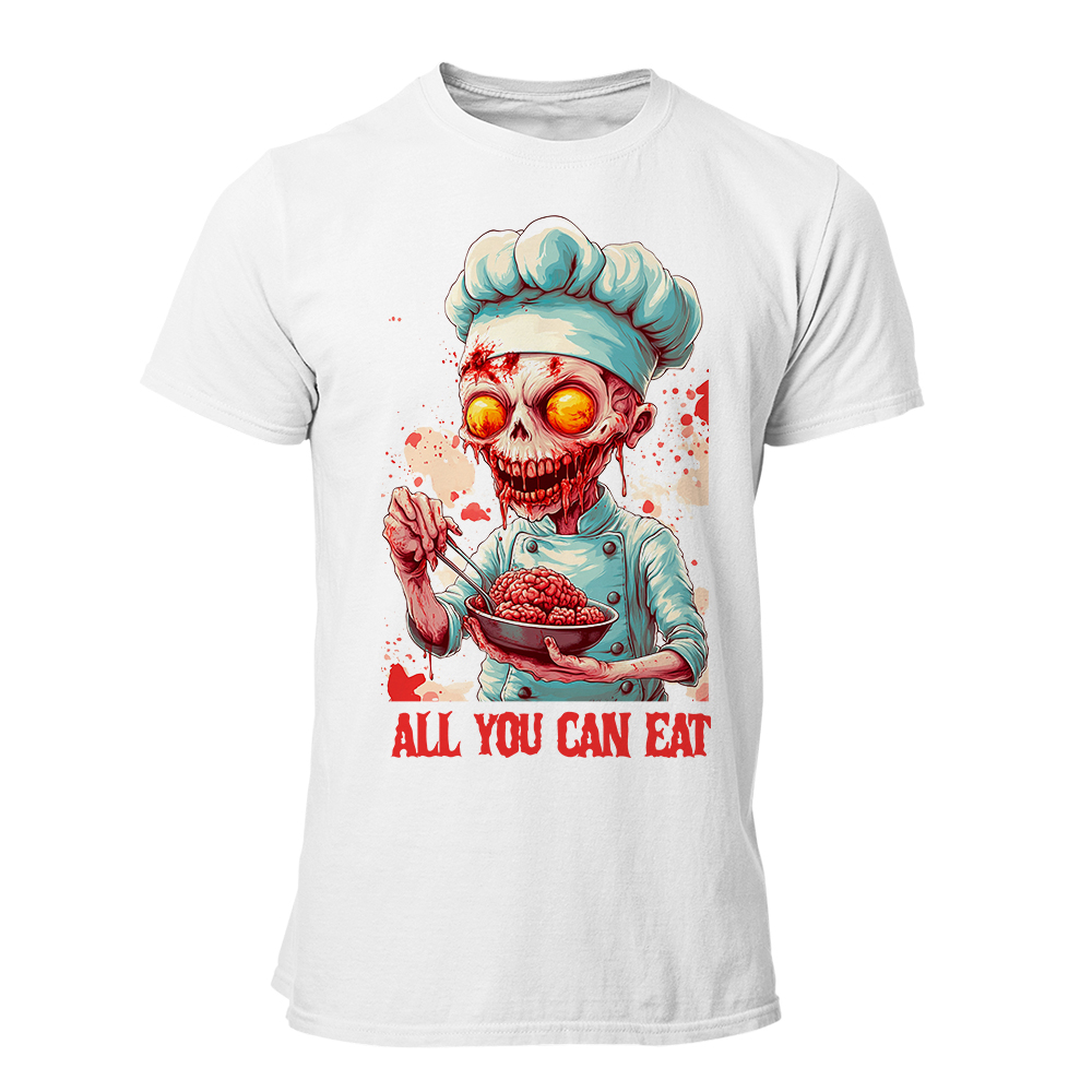 “All You Can Eat” no es solo una frase, es una amenaza (y una promesa) para todos los que se atrevan a mirarte sin reírse. Es la camiseta perfecta para los que ya no creen en los influencers de recetas y prefieren un menú con sangre, vísceras y sentido del humor.