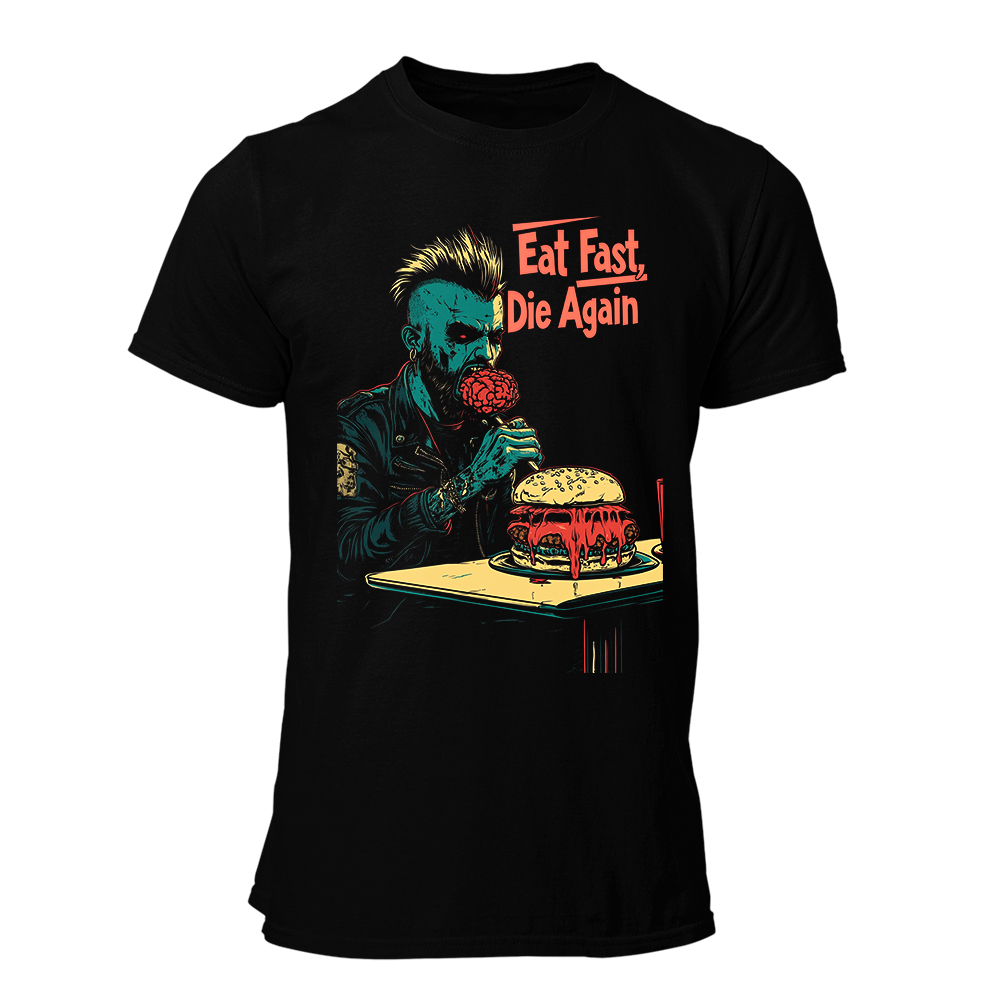 “El que come rápido, muere pronto”… ¡pues mejor! Así repites. El diseño lo dice todo: un zombie punk, un cerebro en la mano, una hamburguesa digna del apocalipsis y un lema que no deja lugar a dudas. No es fast food. Es dead food.