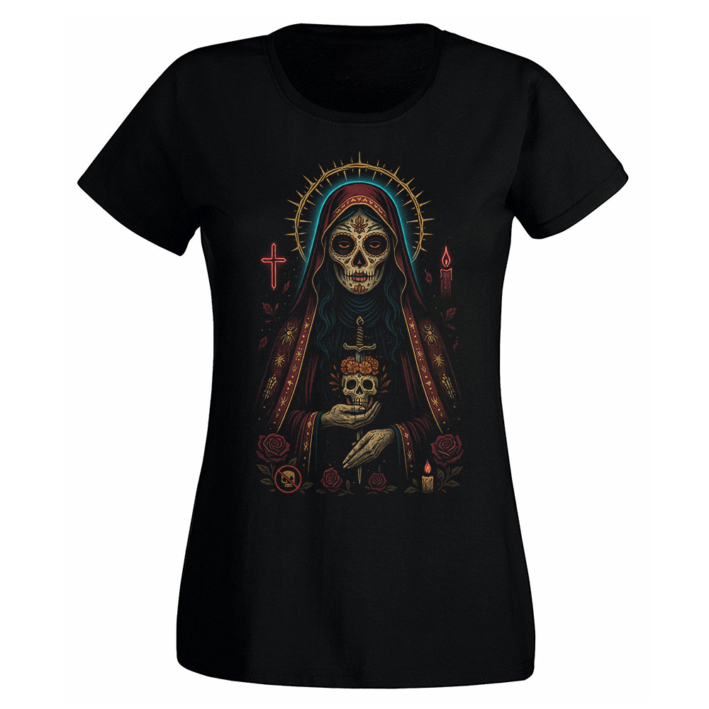 Ella no te salva. Te protege, que no es lo mismo. Esta camiseta es un talismán macabro, una estampa que reza por las guerreras modernas que no se callan ni muertas. La Catrina con corona de espinas y ojos que atraviesan la mentira es tu nueva guía espiritual.