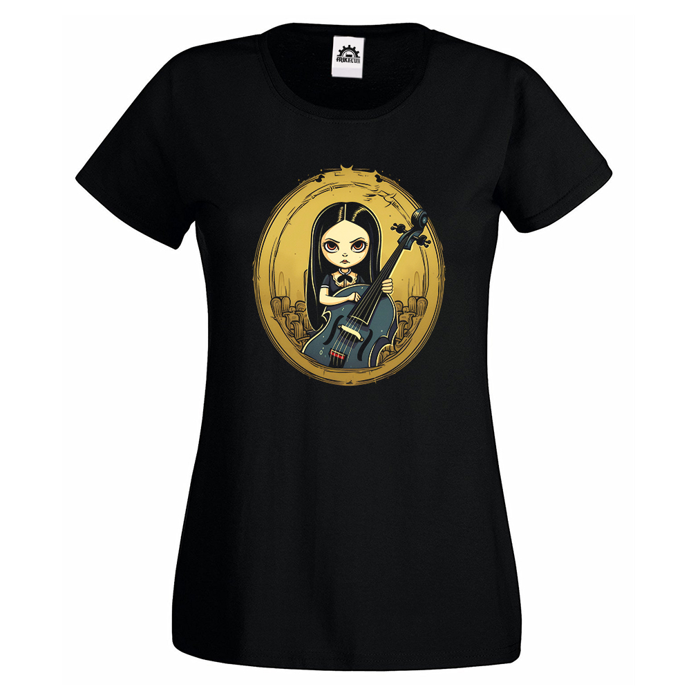 Expresa tu lado más oscuro con esta camiseta de mujer Gothic Girl – Cello Cartoon. Un diseño encantador que combina la dulzura de una ilustración en estilo cartoon con la intensidad de una chica gótica tocando el violonchelo. El contraste del fondo dorado le añade un toque de distinción.