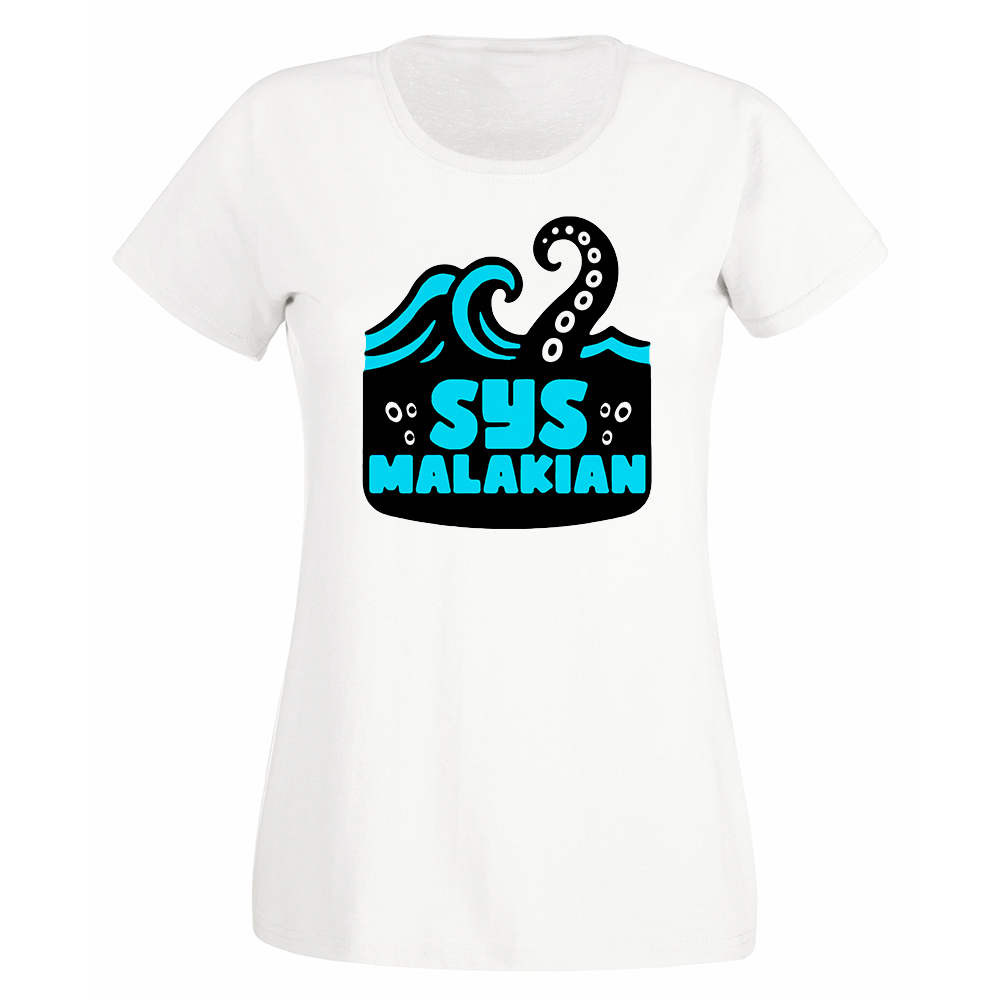 Sys Malakian, surf rock mujer, camiseta blanca mujer, logo cartoon, diseño oceánico, instrumental surf, cultura tiki, ola y tentáculo, estética retro, vibes playeras, música surf, algodón premium, look veraniego, rock instrumental, surf culture, moda alternativa, surf vibes, diseño minimalista, escena surf, vibes frescas, guitarra surf, música instrumental moderna, estética oceánica, moda juvenil, reverb, diseño artístico, playa, ropa cómoda, estilo retro surfer.