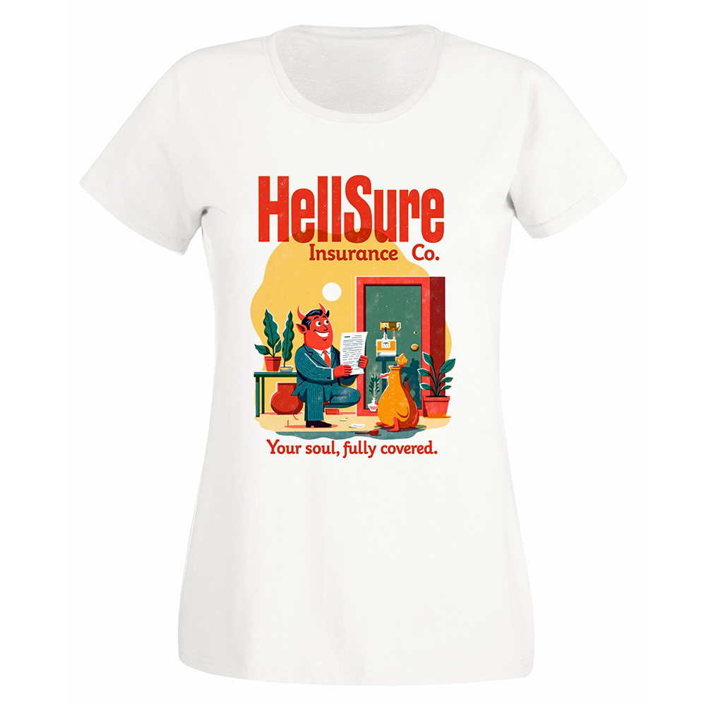 Esta camiseta es como un contrato con el diablo, pero con estampado adorable y mucho más estilo. “HellSure Insurance Co.” representa la fusión perfecta entre el mundo de las aseguradoras y el infierno, porque nada da más miedo que una cláusula perpetua y no negociable con fuego incluido.