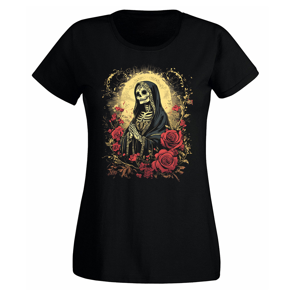 Si crees en algo, que sea en ti. Y si llevas algo, que sea esto. El diseño hipnótico de la Virgen esqueleto rodeada de rosas es un puñetazo visual que no pide permiso. Para mujeres que no suplican, que bendicen a su manera y que no le tienen miedo ni al juicio final.
