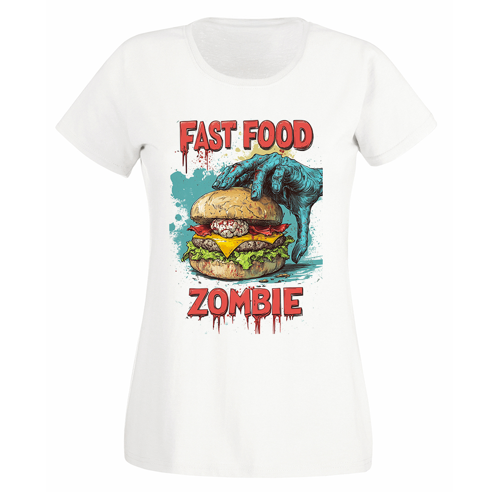 ¿Cansada de looks sosos y mensajes «cuquis»? Aquí tienes el antídoto: una hamburguesa zombie servida con ironía, sangre y un extra de neuronas. La camiseta “Fast Food Zombie” es para ti si te gusta el rollo creepy pero con estilo, y si no te da miedo mezclar ketchup con sesos.