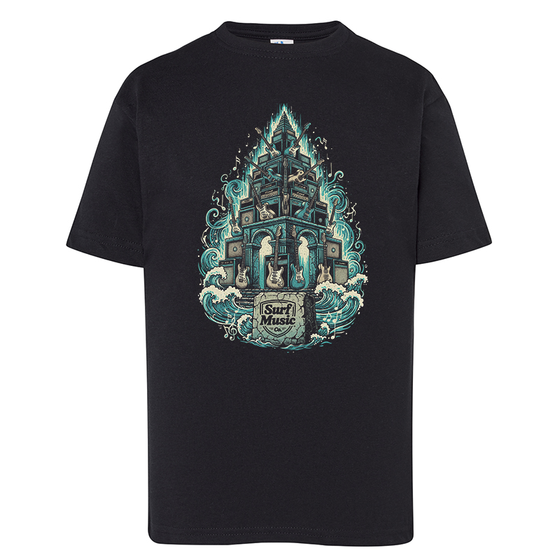 Hay castillos, fortalezas, torres… y luego está este templo sagrado de guitarras y amplis. Esta camiseta es para los peques que se montan sus propios mundos, llenos de olas gigantes, música a todo volumen y edificios que suenan.