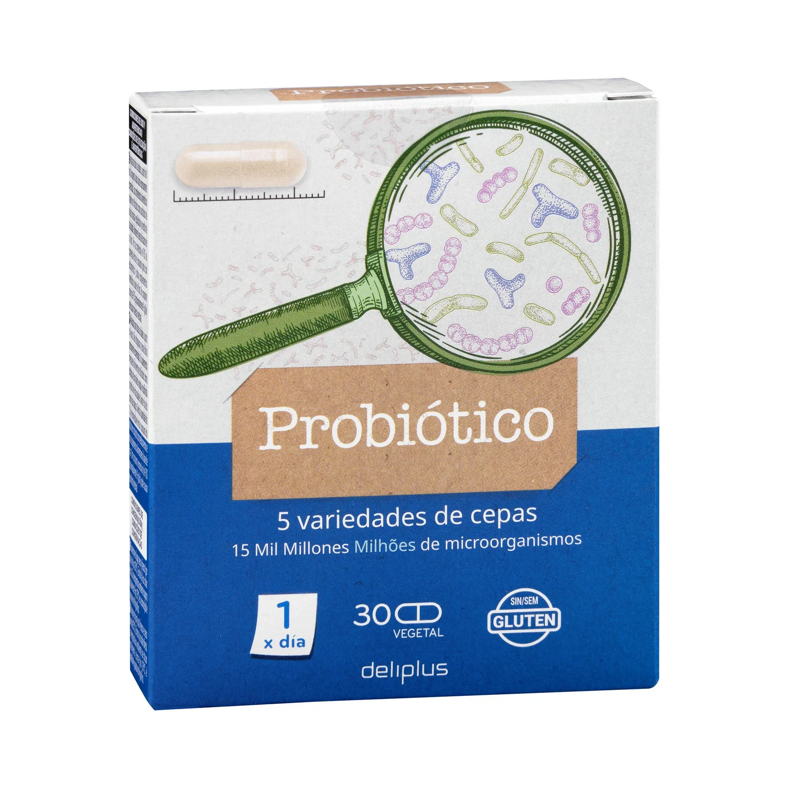 Cápsulas Probiótico Deliplus, un producto típico disponible en España. Pertenece a la variedad de fitoterapia. Ideal para españoles que viven fuera de Europa y quieren seguir cuidándose con productos que conocen, y para europeos que buscan referencias auténticas del mercado español.