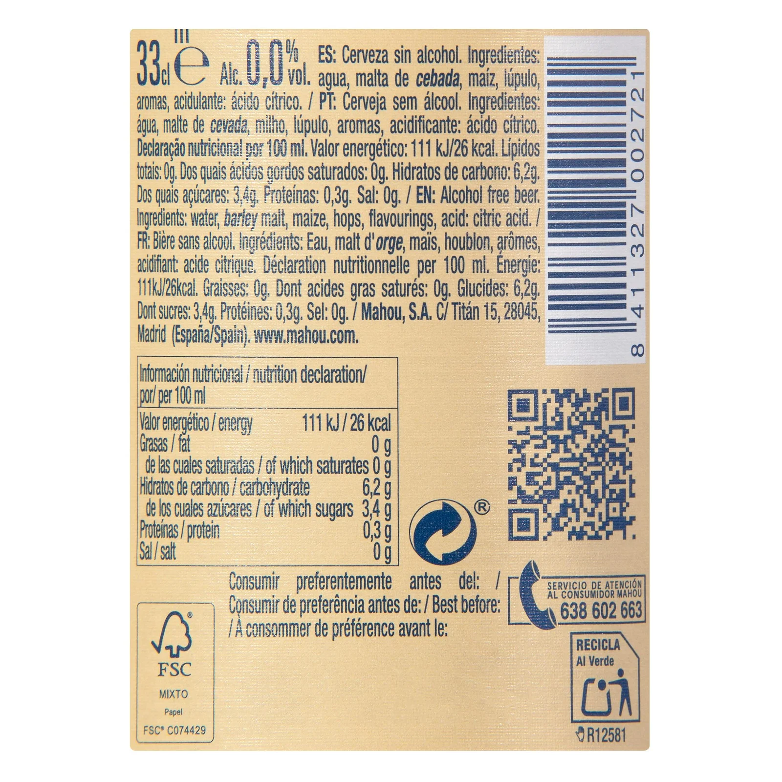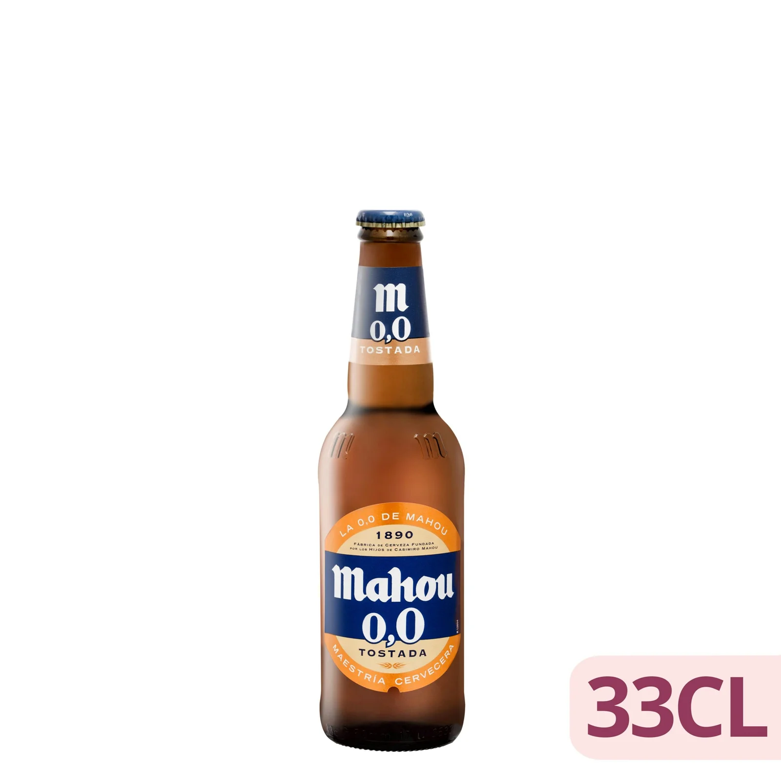 Cerveza 0,0% sin alcohol tostada Mahou – producto español auténtico, ideal para quienes buscan el sabor de España en Europa.