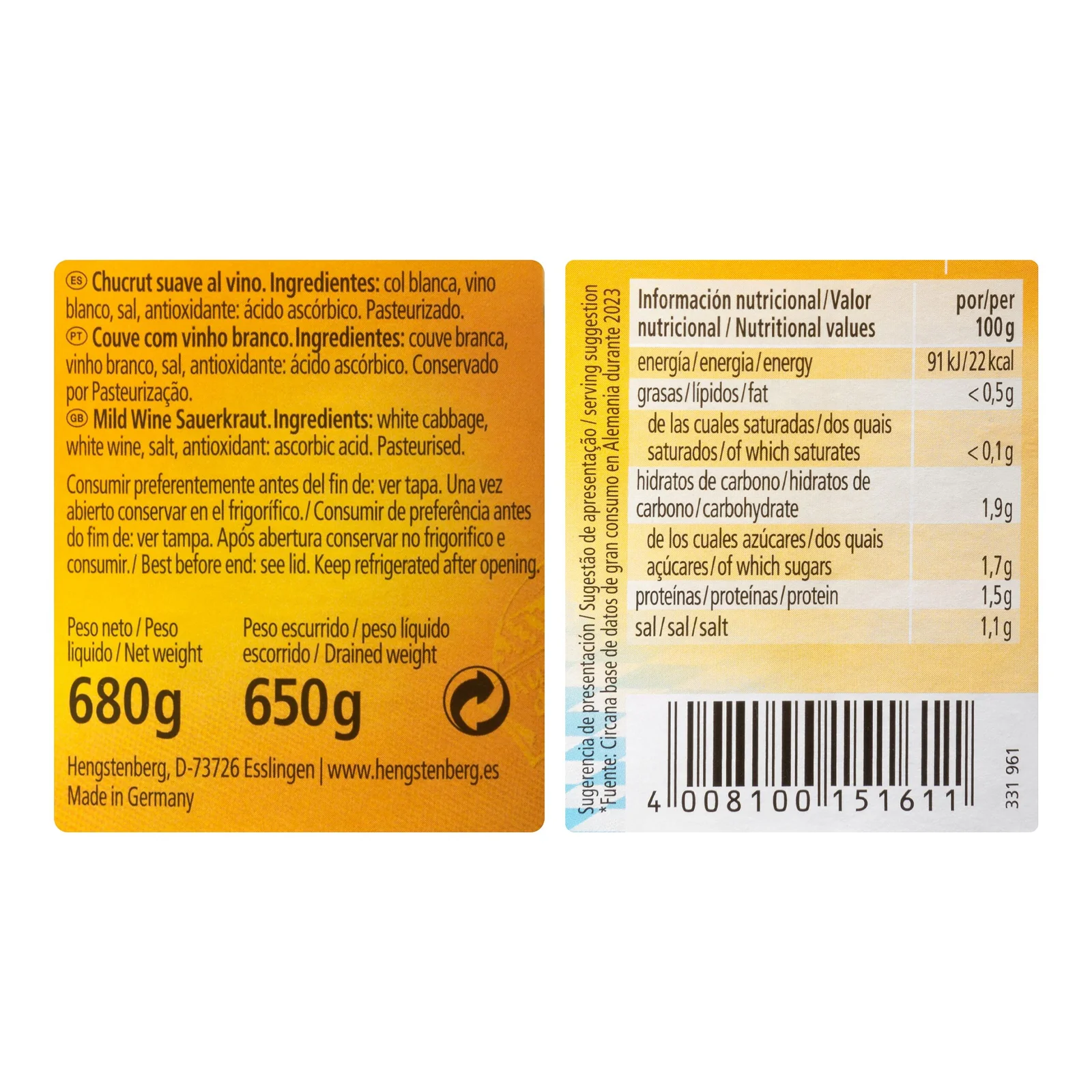 Chucrut al estilo bávaro Hengstenberg, un clásico del mercado español. Forma parte de la variedad de conservas verdura. Ideal para españoles fuera de Europa que buscan sabores de casa y para europeos que desean productos auténticos de España.