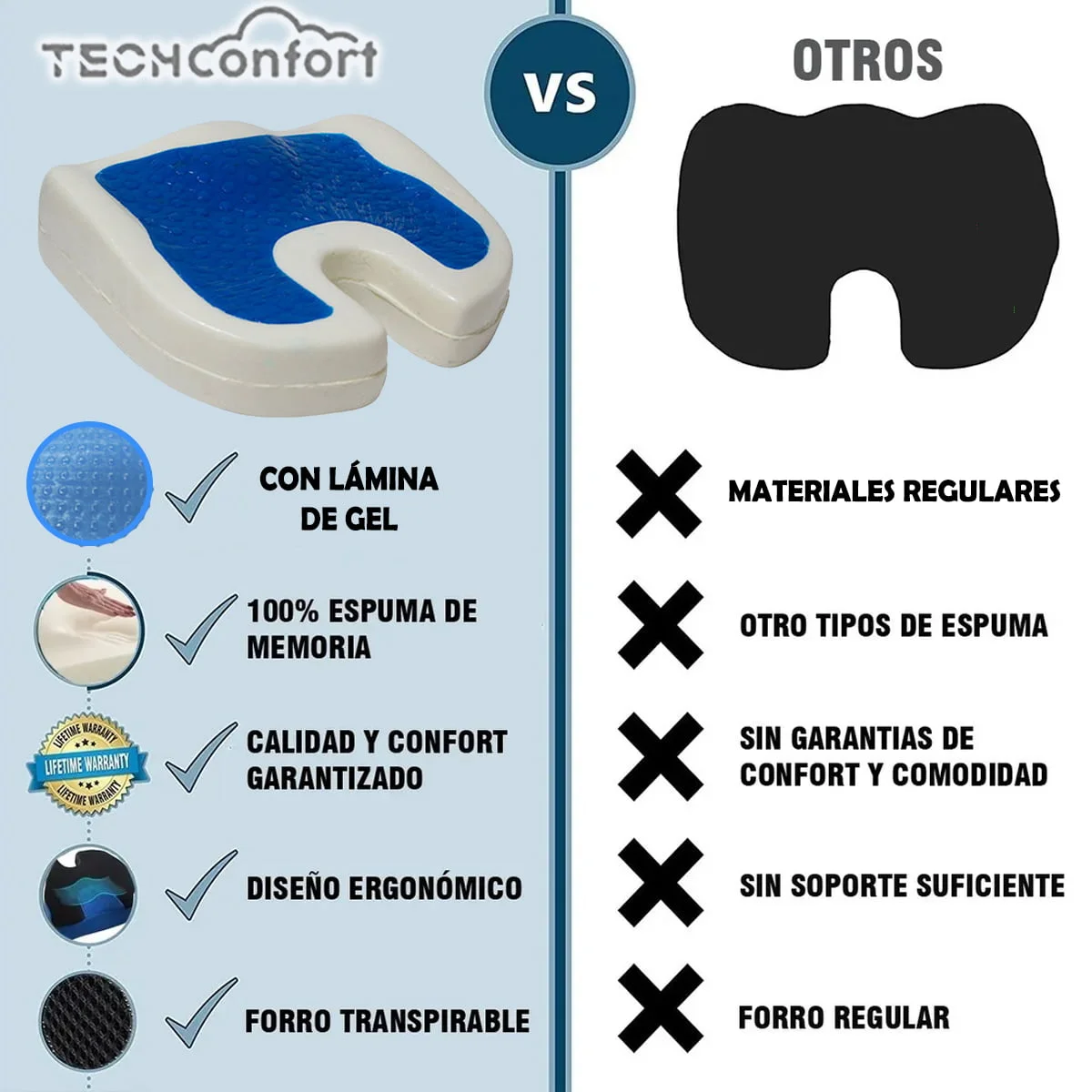 ACERCA DE ESTE PRODUCTO: Este cojín está fabricado con espuma viscoelástica Memory Foam con una LÁMINA DE GEL que ayuda a disipar más rápidamente el calor y alivia puntos de presión. Provee comodidad, suavidad y a su vez soporte. Multiusos: como cojín de asiento de automóvil, cojín de asiento de silla de oficina, cojín de silla de ruedas, cojín para viajar y demás. La espuma viscoelástica memory foam se hunde para tomar la forma de su cuerpo y aliviar puntos de presión en zonas estratégicas como coxis, piernas, cadera, ciática, próstata, cintura. No se deforma, siempre vuelve a su forma original.
