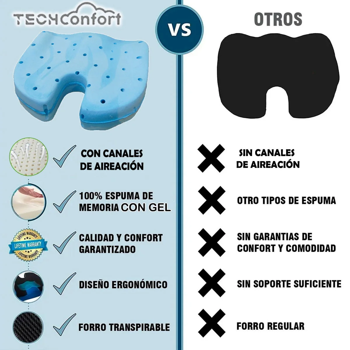 Este cojín está fabricado con espuma viscoelástica Memory Foam con una infusión de GEL COOL FRESH que le proveen frescura, comodidad, suavidad y a su vez soporte, además cuenta con CANALES DE AIREACIÓN para maximizar estas propiedades.