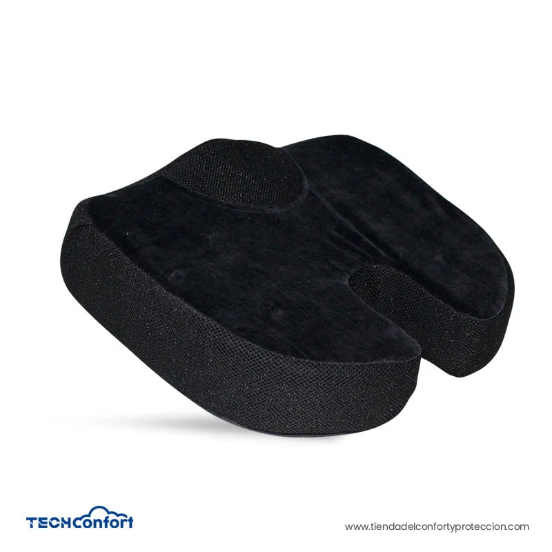 Cojín para coxis fabricado en espuma viscoelástica memory foam, con infusión de gel líquido en la espuma. Con diseño ergonómico en forma de U y canales de aireación. Forro extraíble color negro y gris.