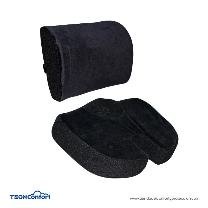 CARACTERISTICAS: TAMAÑO COJIN COXIS 40cm largo x 45cm ancho x 9 cm espesor *TAMAÑO SOPORTE LUMBAR 39cm Ancho x 32cm Alto x 6cm espesor en su parte céntrica y 12 cm de espesor a cada lado. *Fabricados en viscoelástica memory foam con LAMINA DE GEL *Con forro extraible color negro.