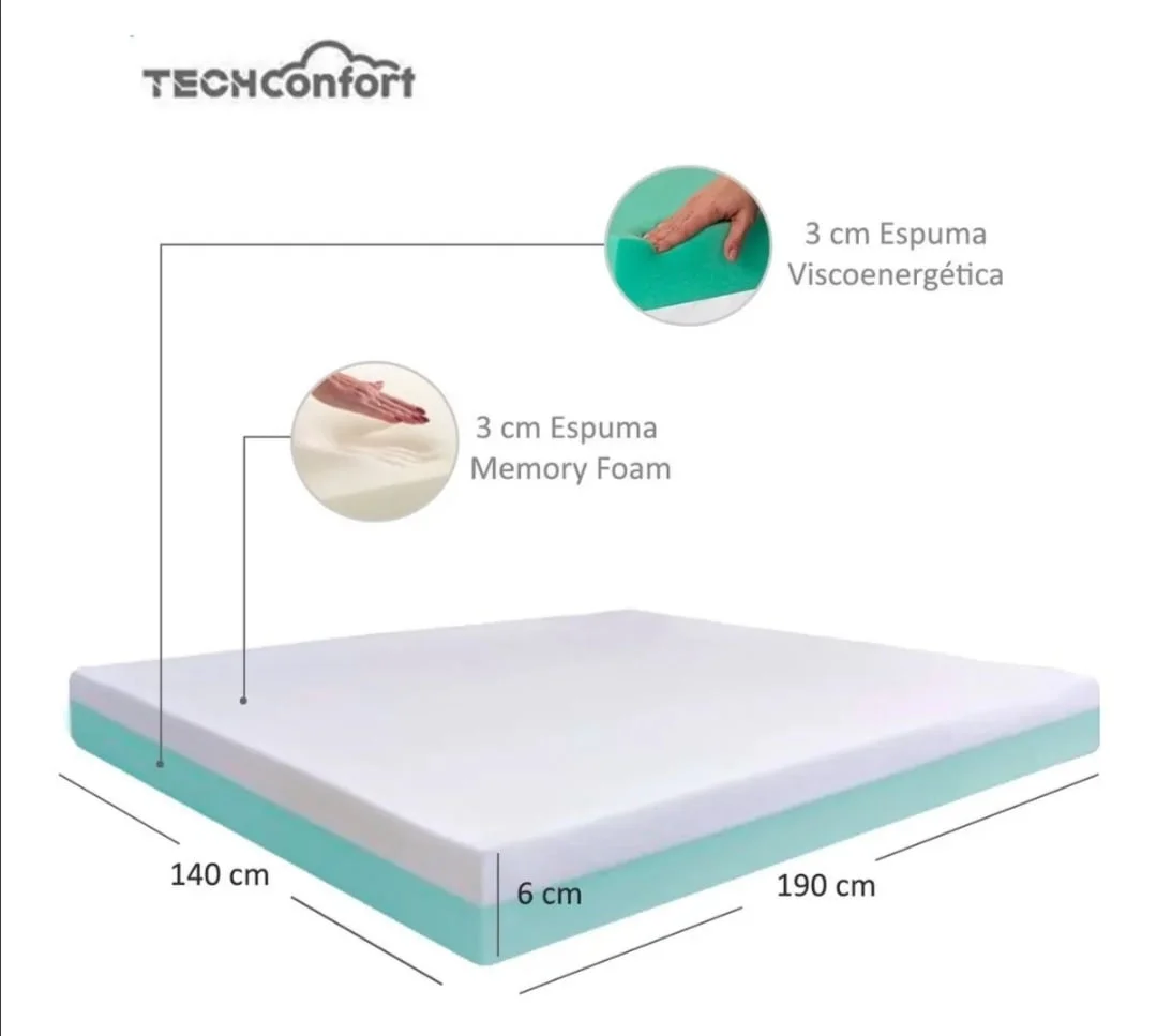 DISFRUTA LA EXCLUSIVA COLCHONETA/SOBRECOLCHÓN CON TECNOLOGÍA DUAL, combina dos excelentes materiales, ESPUMA MEMORY FOAM + ESPUMA VISCOENÉRGETICA, brindándote el máximo confort y posibilidades para un descanso placentero. TOTAL DE ESPESOR 6 cm.