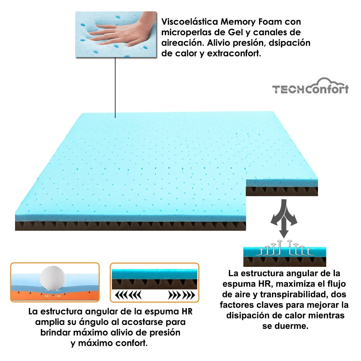 ESPUMA MEMORY VISCOGEL CON AIREACION: Se hunde suavemente para aliviar presión en zonas estratégicas y brindar mayor confort, es un material suave que permite suavizar un colchón duro e incomodo. No se deforma, siempre vuelve a su forma original. Sus canales de aireación brindan mayor disipación de calor y crean pequeñas corrientes de aire para mejorar el flujo del mismo. Induce la buena postura natural de su cuerpo evitando posiciones que produzcan incomodidad y mal descanso. La espuma viscoelástica Memory Foam es antimicrobiana, por lo tanto, es resistente a los alérgenos, el moho y los ácaros del polvo. Se adapta perfectamente a tu temperatura corporal logrando un descanso de alto confort.