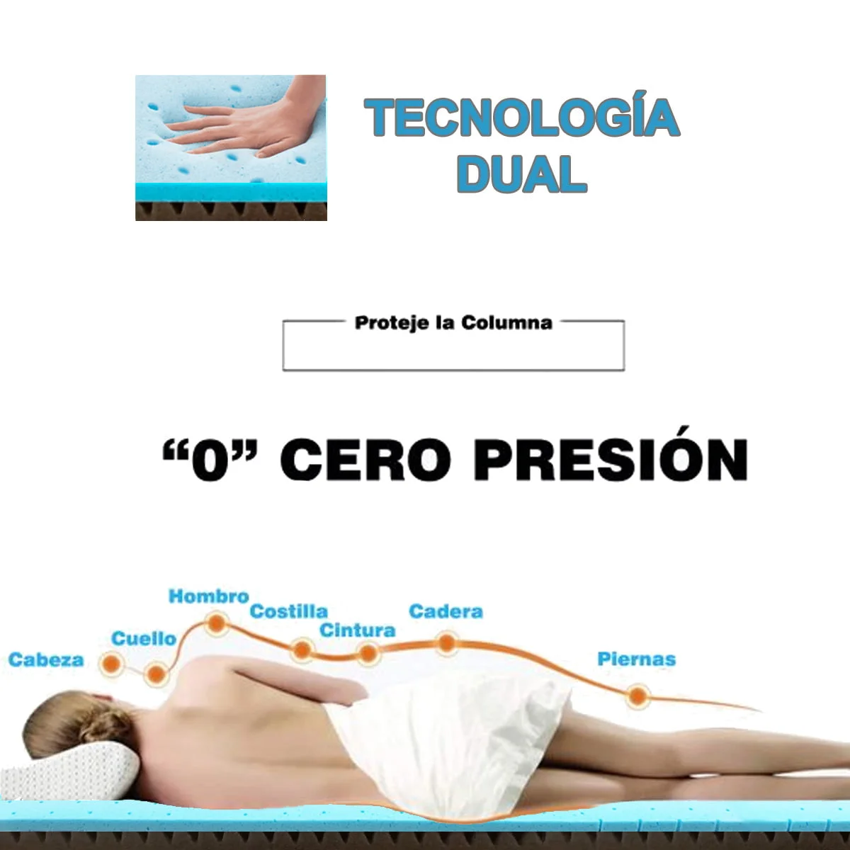 DISFRUTA LA EXCLUSIVA COLCHONETA/SOBRECOLCHÓN CON TECNOLOGÍA DUAL, combina dos excelentes materiales, ESPUMA MEMORY VISCOGEL CON AIREACIÓN + ESPUMA HR CON ESTRUCTURA ANGULAR , brindándote el máximo confort y posibilidades para un descanso placentero. TOTAL DE ESPESOR 8 cm.